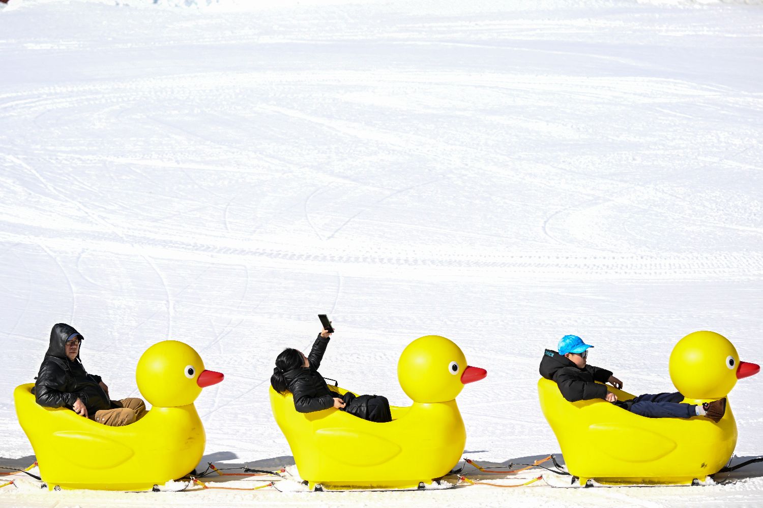 1月29日,游客乘坐“大黄鸭”赏雪。中新社