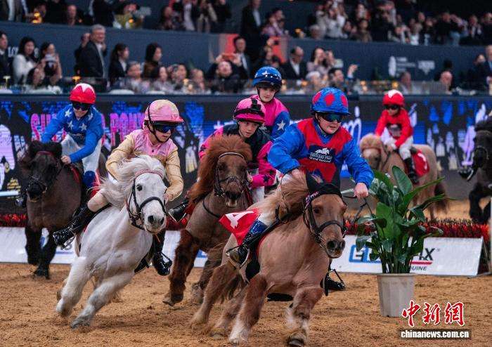 1月31日进行的雪特兰小马大赛中,青少年驾驭小马跃障竞速。中新网