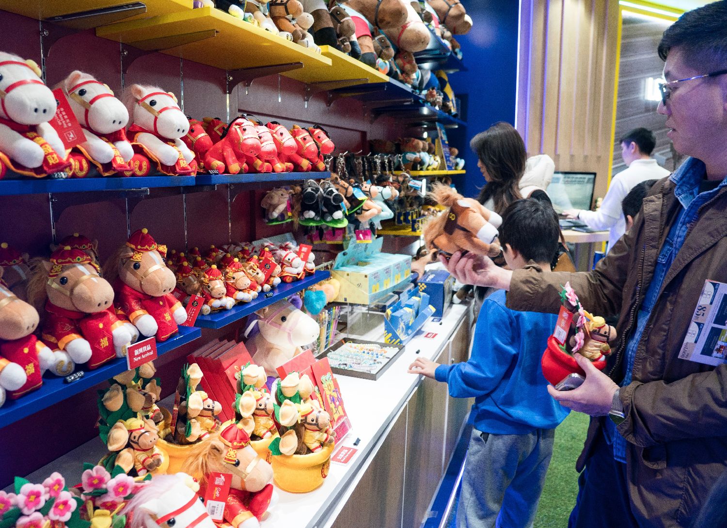 2月1日,观众在赛场外的纪念品销售处选购礼品。中新社