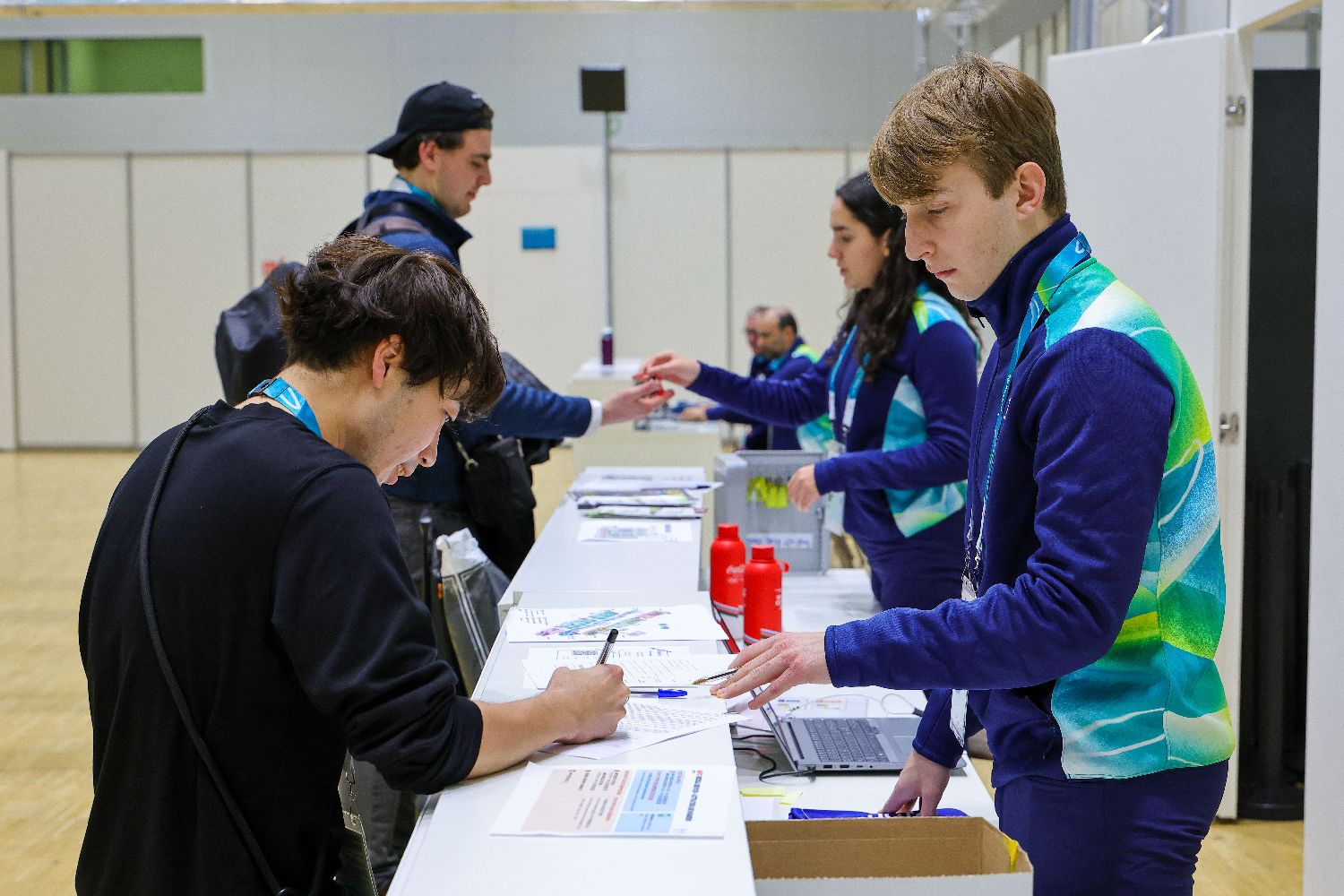 当地时间2月2日,志愿者为新闻记者办理注册手续。中新社