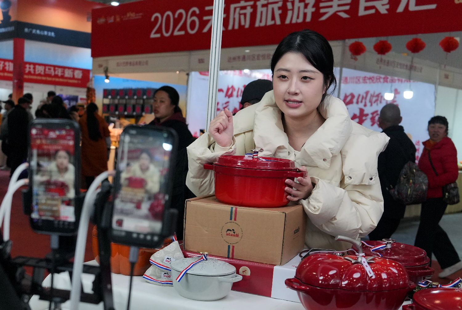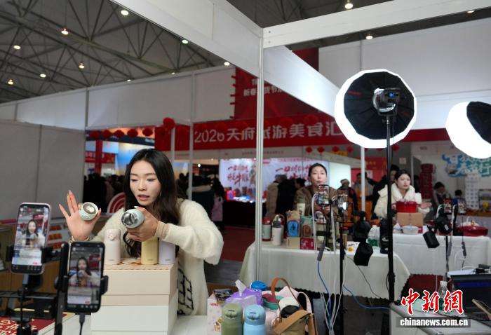 2月2日,在成都举办的第29届中国(四川)新春年货购物节吸引民众参观购物。本届四川年货节以“乐购全球年货,共享美好生活”为主题,来自36个国家和地区、近30个省(市、自治区)、四川省内21个市州的上千家中外企业参展,约10万种优质年货集中亮相。图为新春年货购物节上的电商直播区。中新社