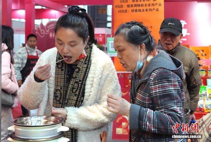 市民在新春年货购物节上品尝参展商品。中新网