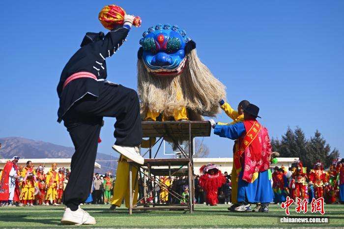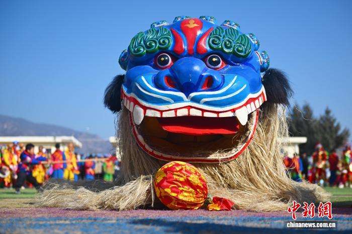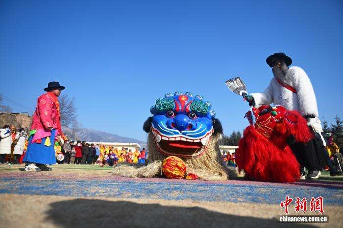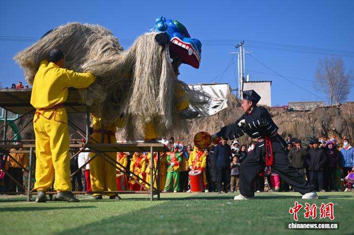 2月3日,在位于甘肃省兰州市榆中县马坡乡上庄村内,村民进行青毛狮子舞狮表演。青毛狮子属于榆中社火独有类型,其需要用古法手工编制,工艺从伏天泥雕狮头模型到裱糊彩绘、挽毛组装,都承载着当地独有的民俗文化。中新网