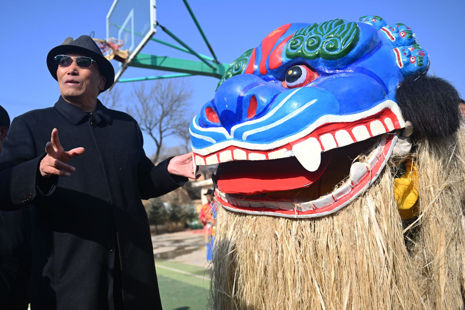 青毛狮子头要选在六月中伏天用白土和麦秆活成“长草泥”来制作狮头模型,也叫泥雕狮子头。狮身则用亚麻制作成狮毛造型。春节前后,人们将择好吉日起狮来祈佑风调雨顺平平安安。图为2月3日,在位于甘肃省兰州市榆中县马坡乡上庄村内,村民进行青毛狮子舞狮表演。中新网