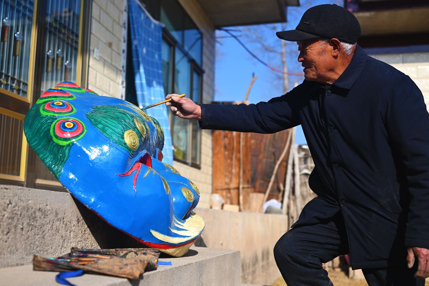 2月3日,村里的老手艺人进行青毛狮子头制作后的点“睛”仪式。中新社