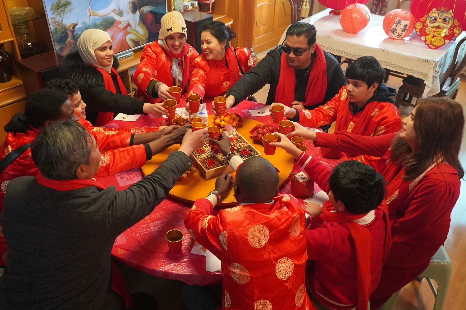 2月3日,在浙江义乌被称作“联合国社区”的鸡鸣山社区,中外居民欢聚一堂包饺子、贴对联、品美食,共迎即将到来的中国农历新年。该社区共有来自74个国家和地区的上千名外籍人士居住。图为当日,中外居民举杯。中新社