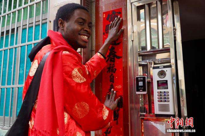 2月3日,外国居民贴对联。中新网