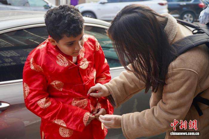 2月3日,外国小朋友穿上中国传统服饰。中新网