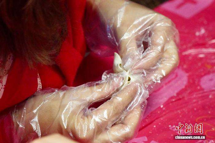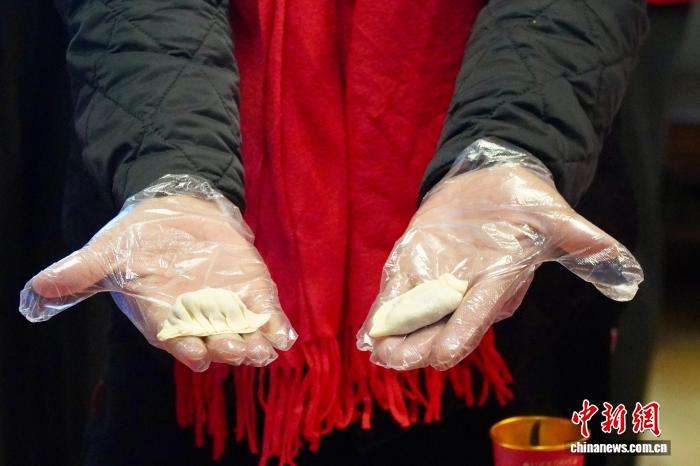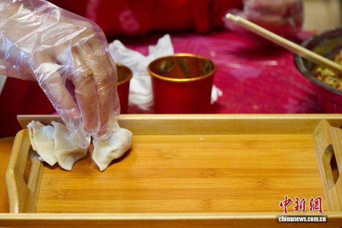 2月3日,外国居民将包好的饺子放入盘中。中新网