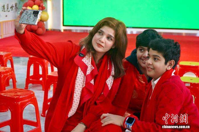 2月3日,外国居民身着中国红服饰拍照。中新网