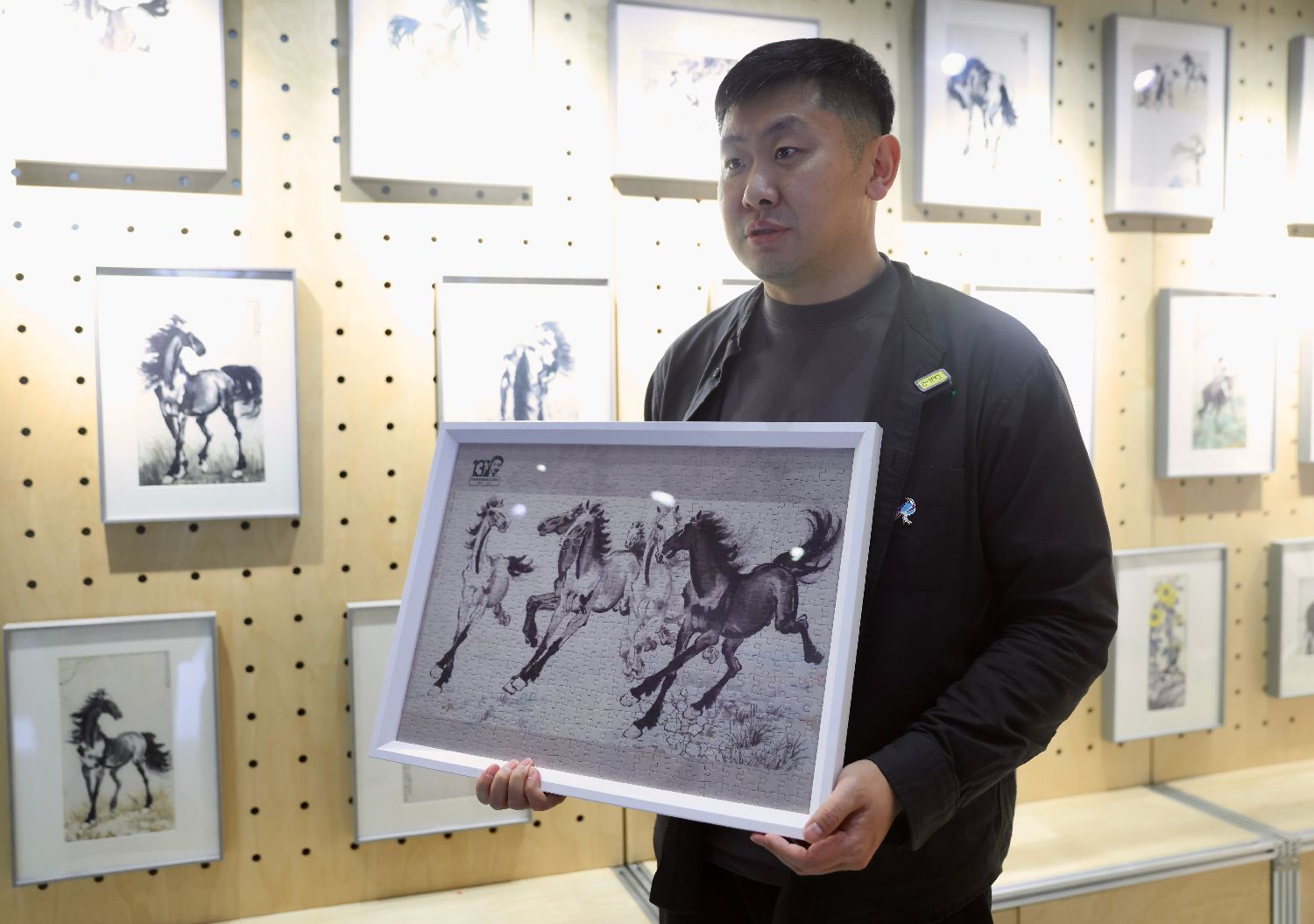 1月15日,徐悲鸿纪念馆社教部主任许经文在位于北京的徐悲鸿纪念馆文创空间介绍《六骏图》拼图。中新社