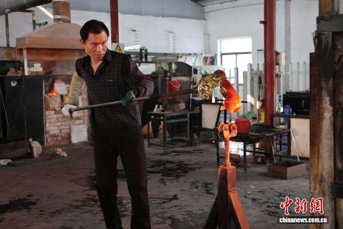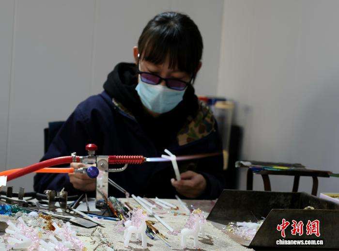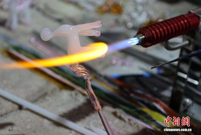 2月4日,灯工在车间内用喷枪火焰制作生肖马文创。中新网