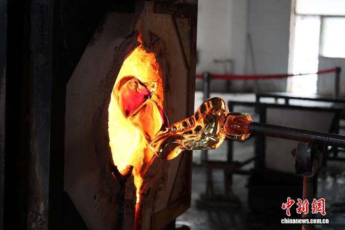 2月4日,炉工手持长杆,在1400℃的炉火高温下烧琉璃。中新网