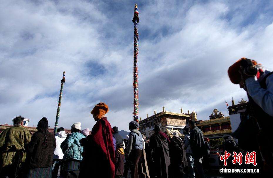 2月5日,更换经幡仪式结束后,崭新的经幡柱屹立在大昭寺广场。中新网