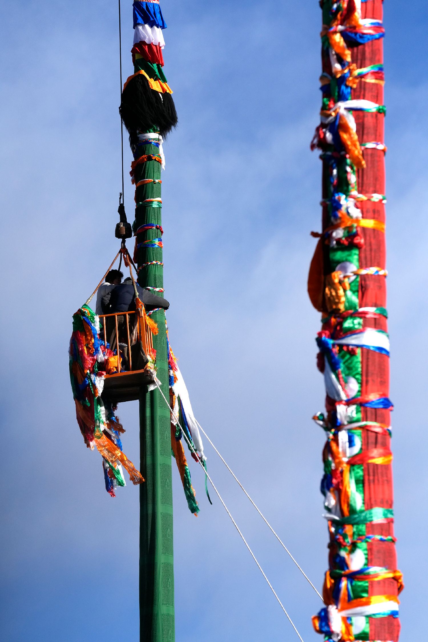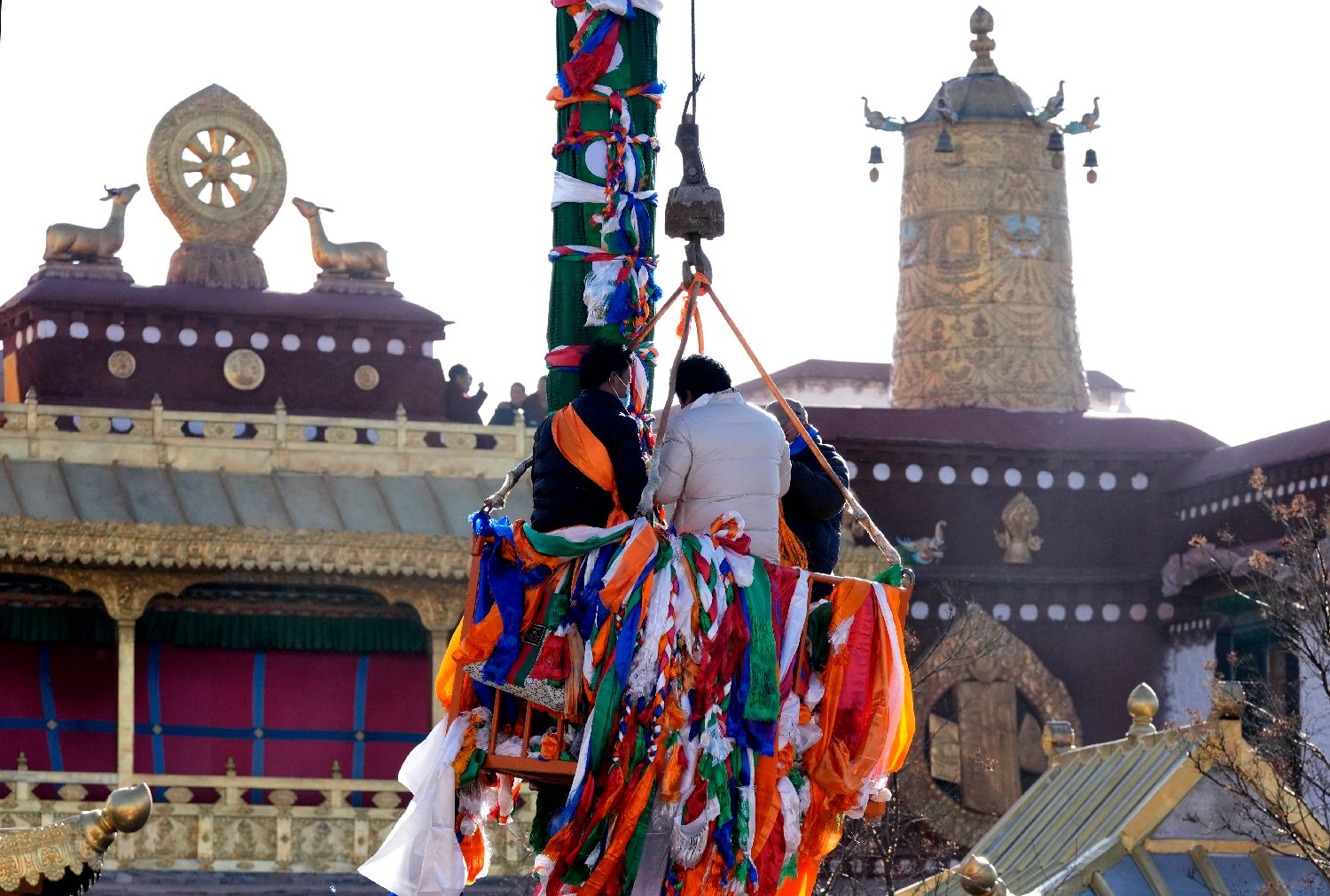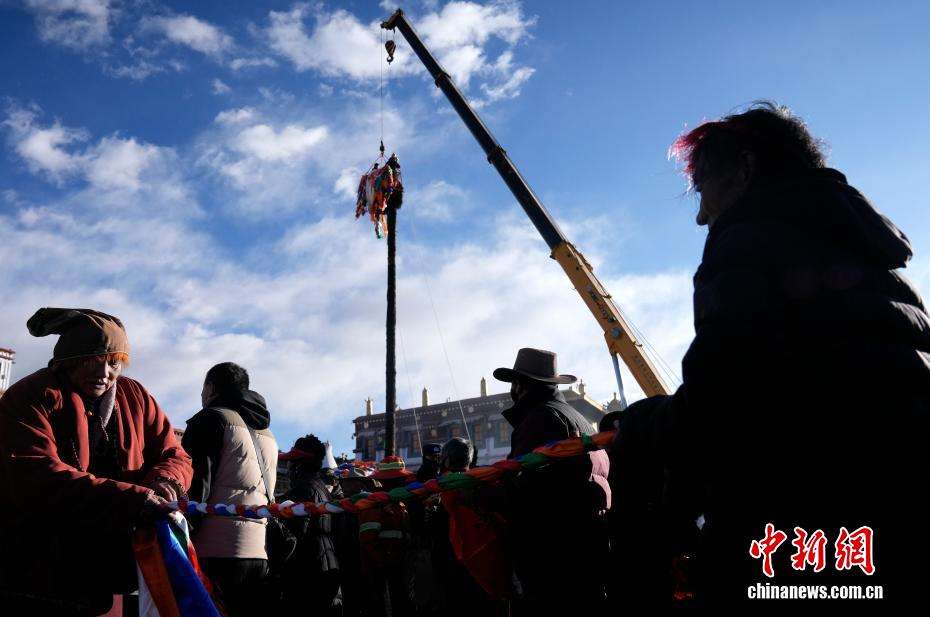 2月5日,工作人员乘坐吊车更换经幡柱上的经幡。中新社