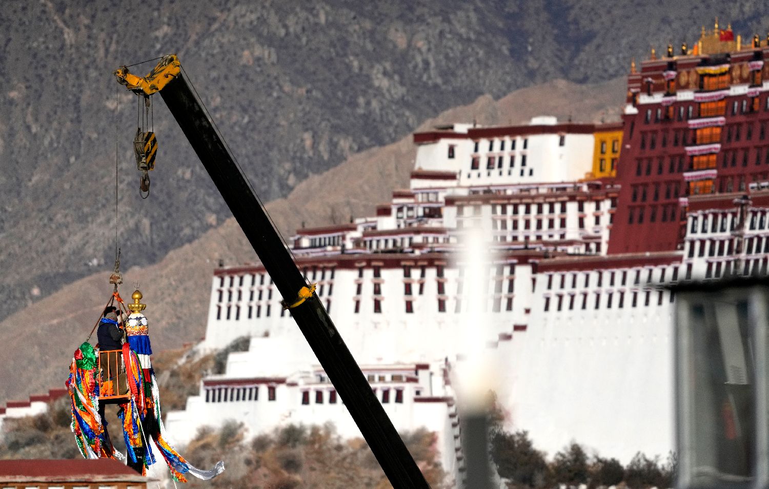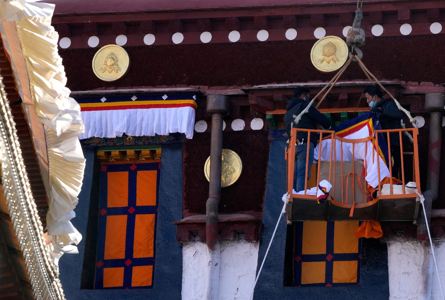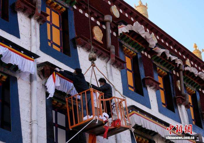 2月5日,工人们正乘坐吊车更换大昭寺“香布”。“香布”是藏式建筑的装饰,通常用五彩棉布缝制,主体为白色,搭配红蓝黄等色的边沿,对窗沿等的颜料及木构件起到保护作用。中新社
