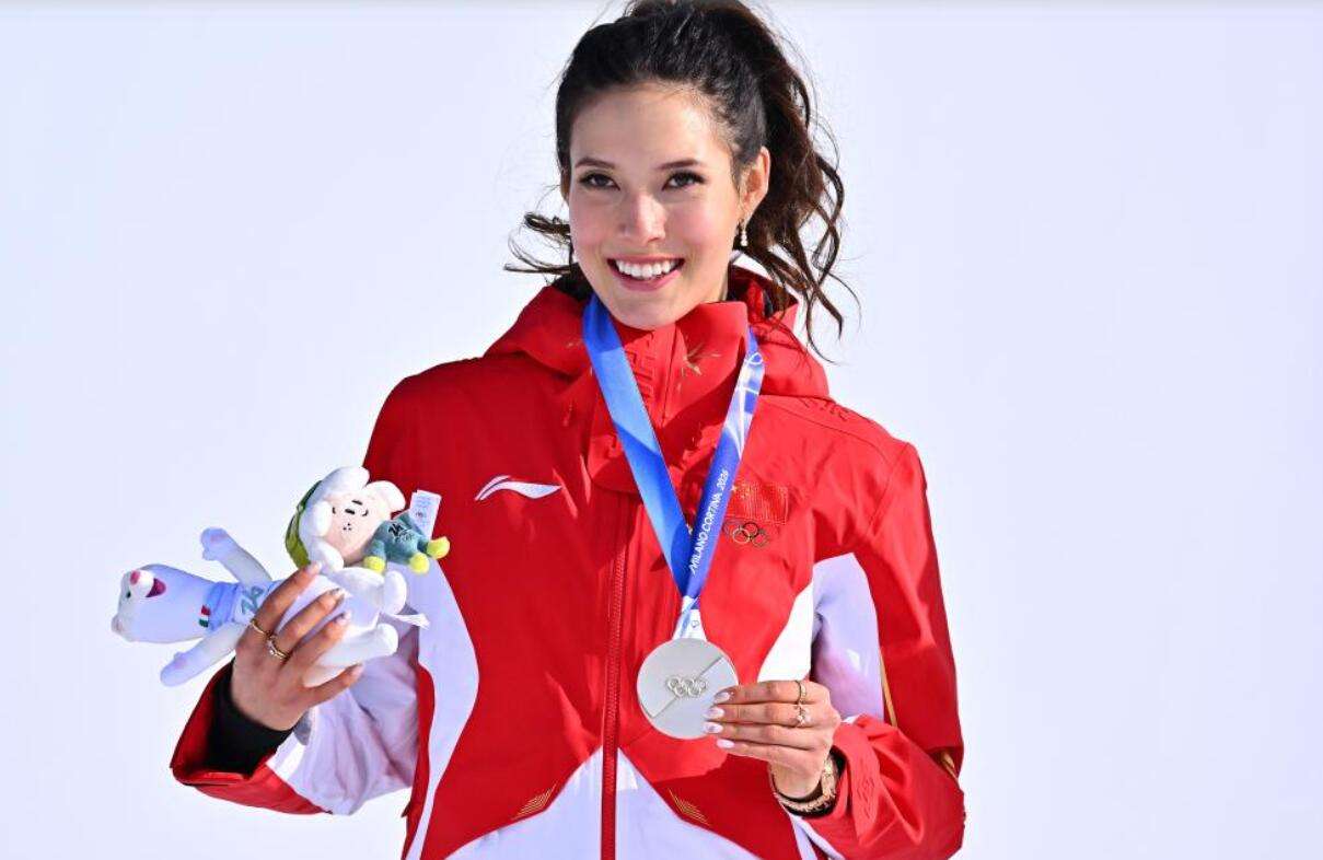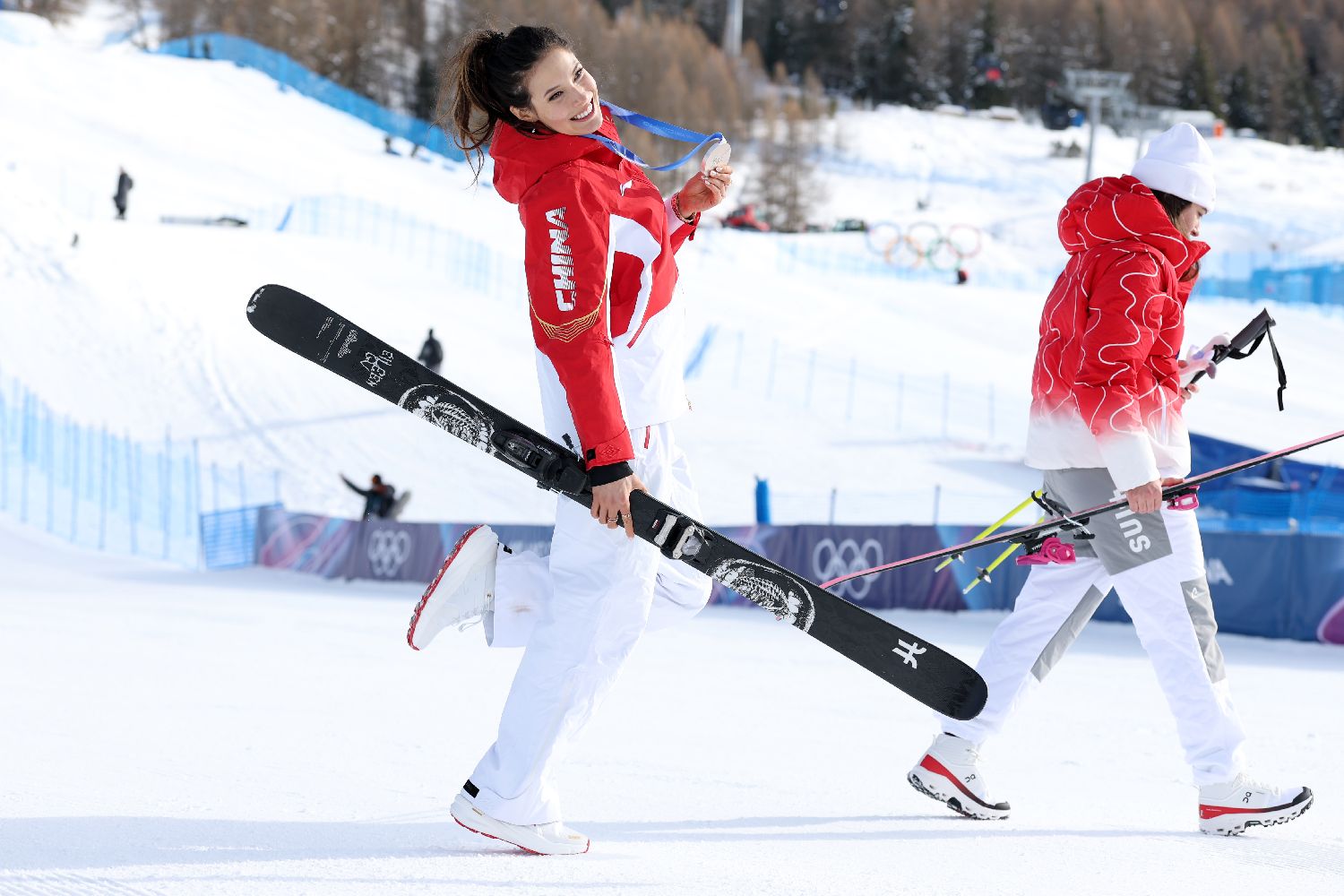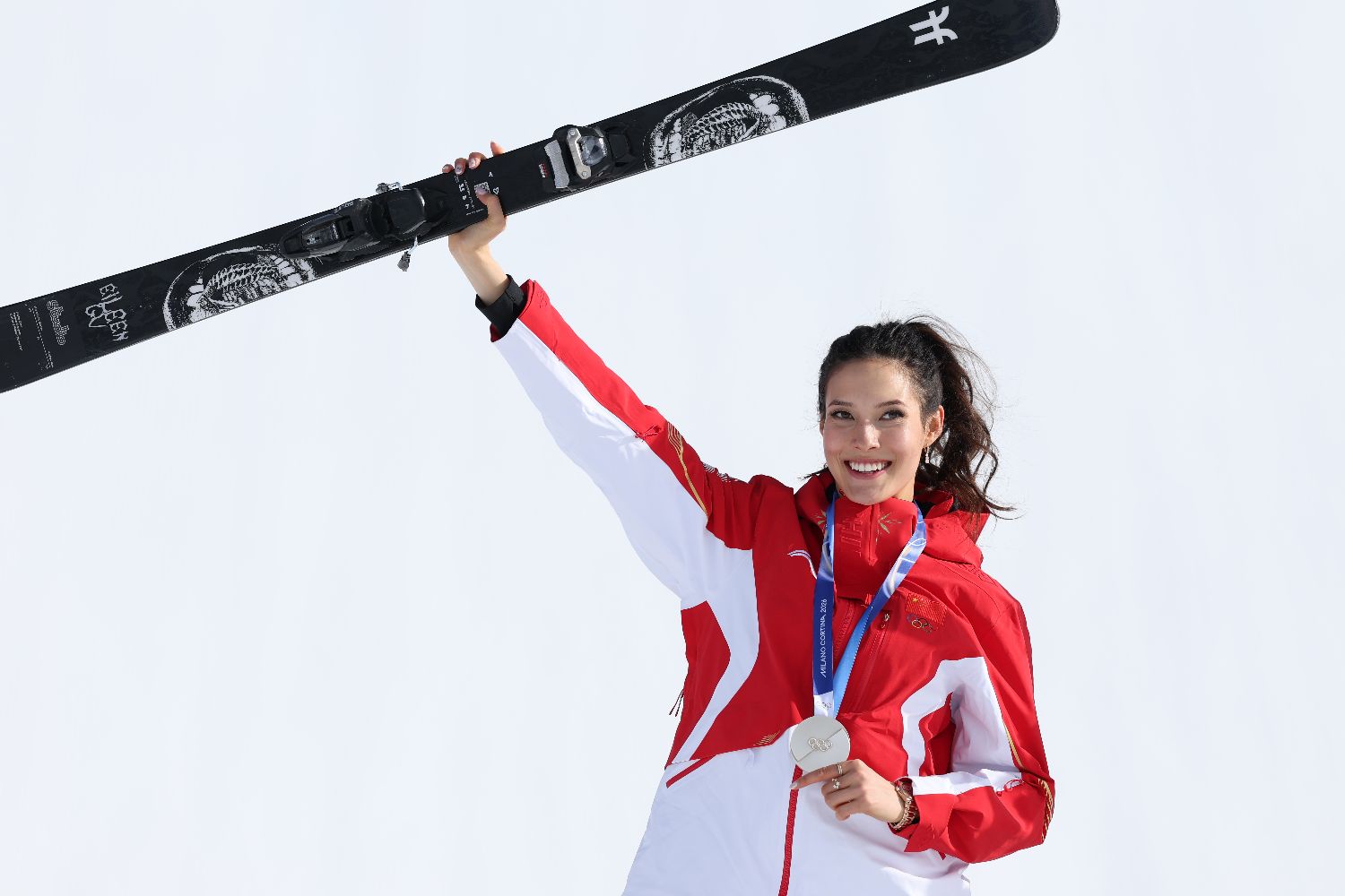 当地时间2月9日,2026年米兰-科尔蒂纳冬奥会自由式滑雪女子坡面障碍技巧决赛在意大利利维尼奥雪上公园举行。中国选手谷爱凌以86.58分摘得银牌。图为谷爱凌获得银牌后举起滑雪板。中新社