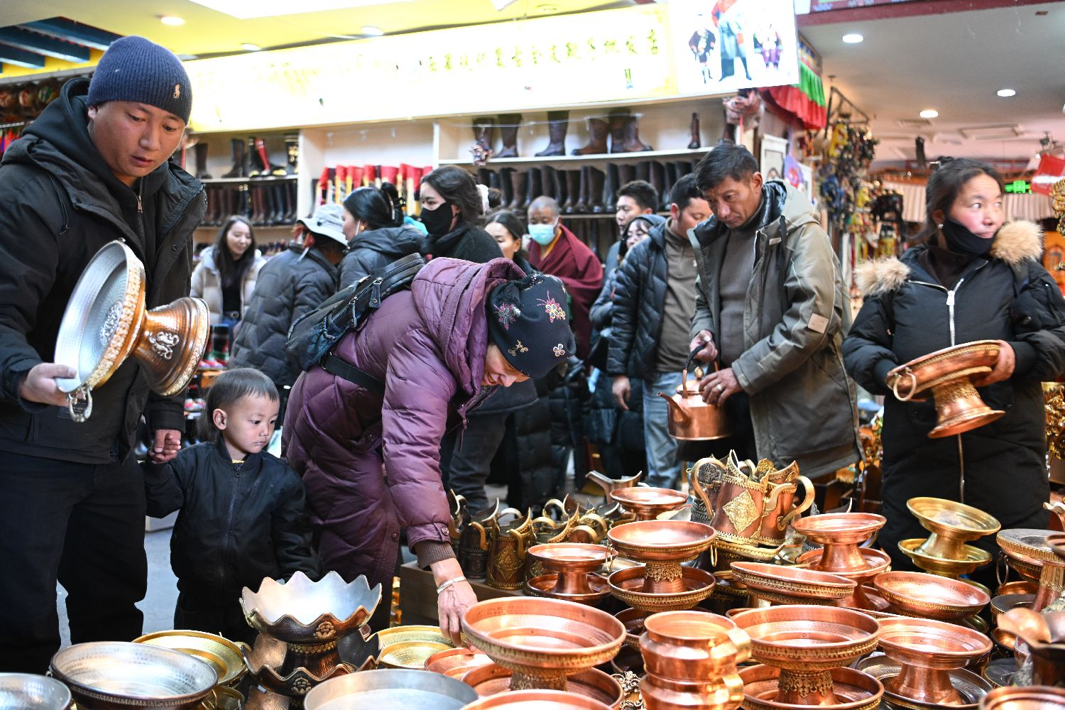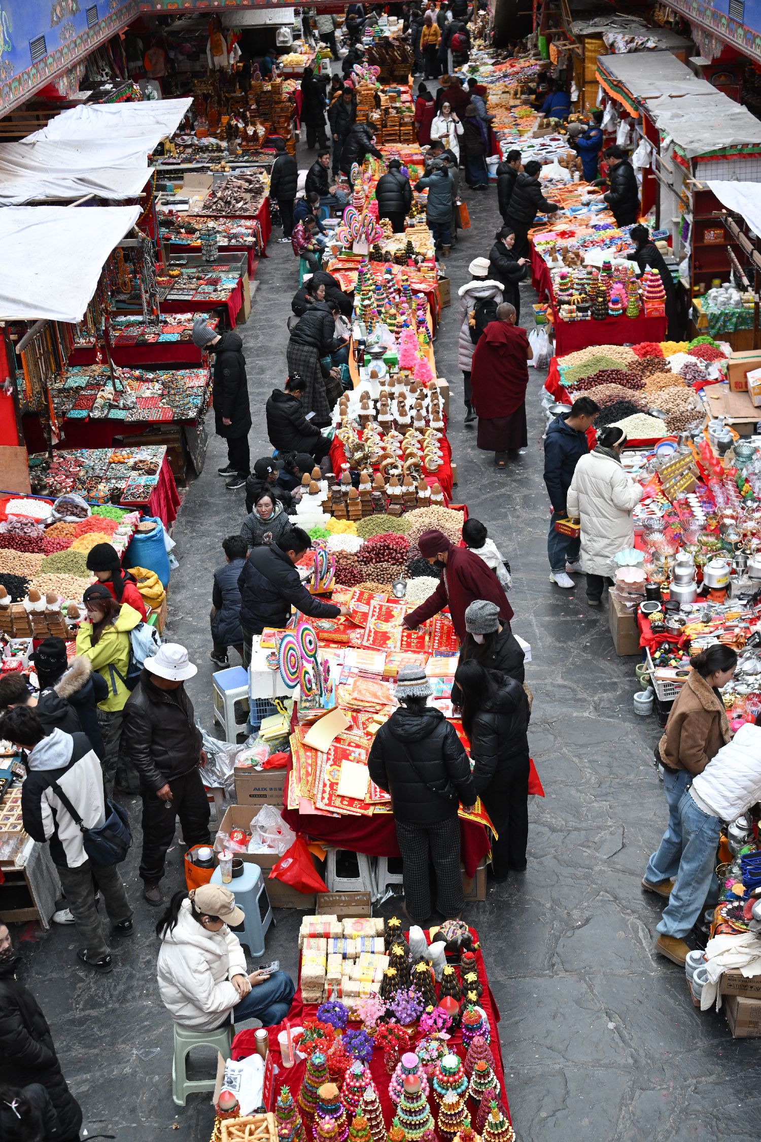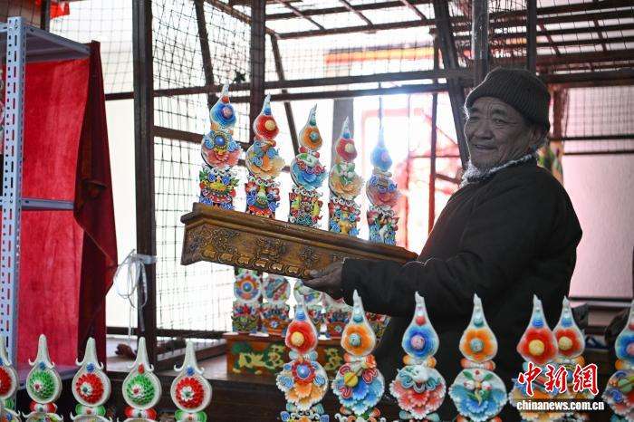 2月9日,随着春节、藏历新年临近,西藏拉萨市八廓商城内,市民忙着挑选酥油花、香布、切玛盒等传统年货,市场内购销两旺、喜庆热闹,古城拉萨处处洋溢着浓厚的节日氛围。图为拉萨民众挑选年货。中新社