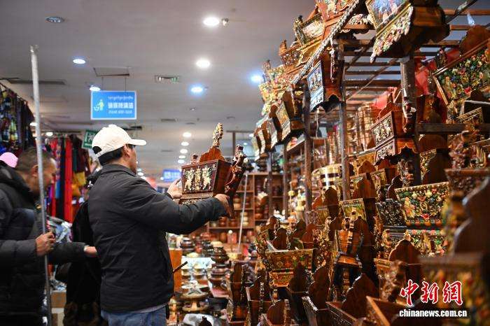 2月10日,西藏拉萨市八廓商城内,市民忙着挑选酥油花、香布、切玛盒等传统年货。中新社
