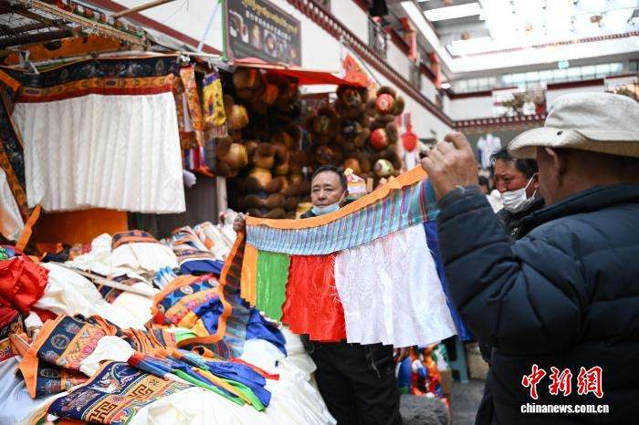 2月9日,市民在八廓商城选购年货香布(藏式建筑门窗上装饰的五彩布料)。中新网