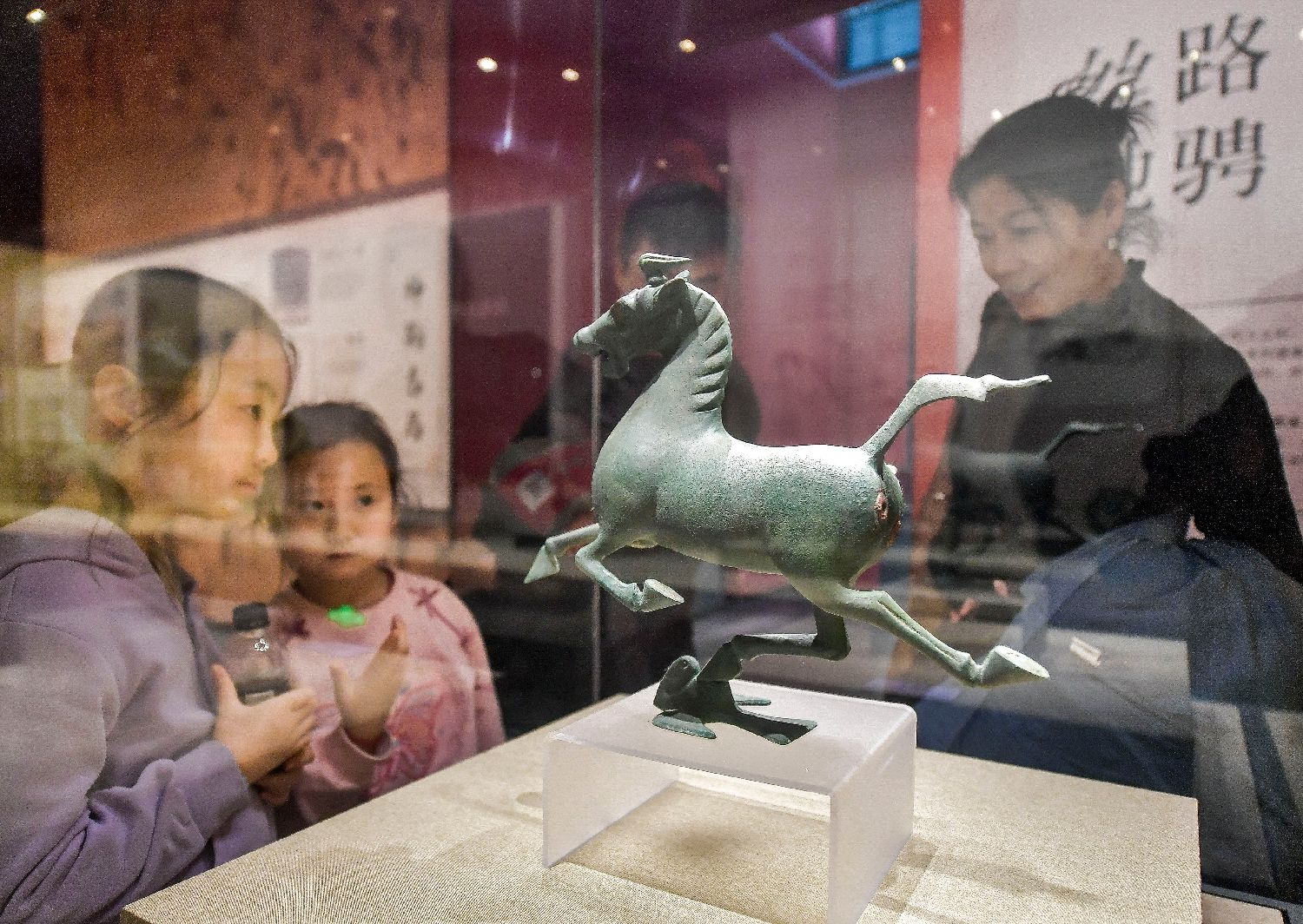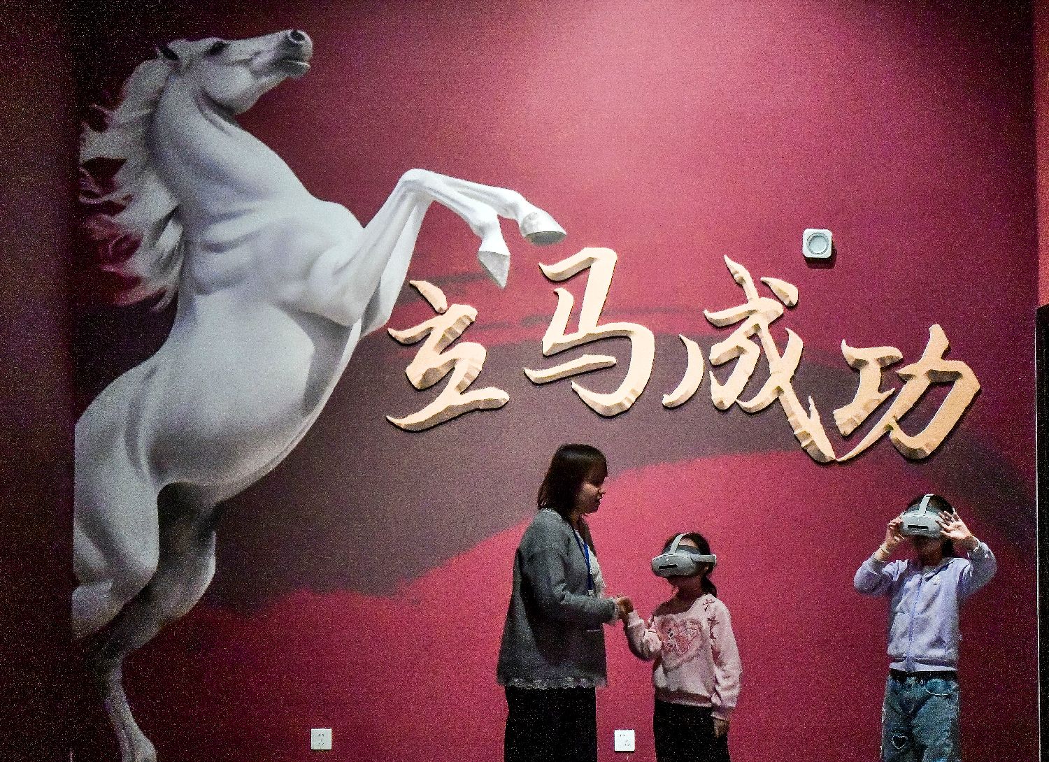 互动体验区,工作人员带着小朋友通过AI眼镜观赏骏马风采。中新社