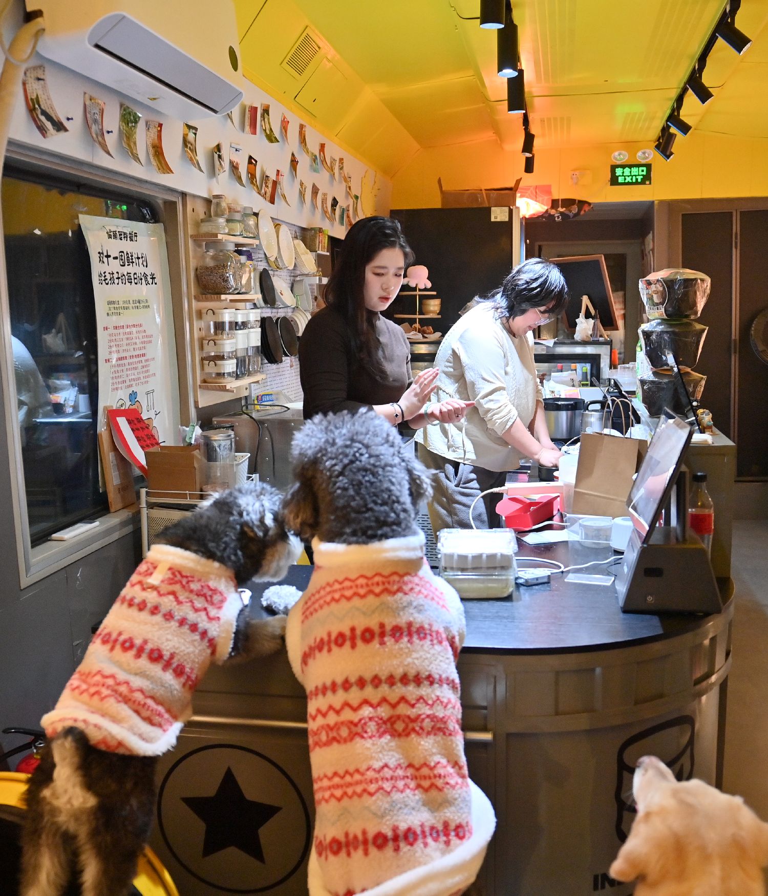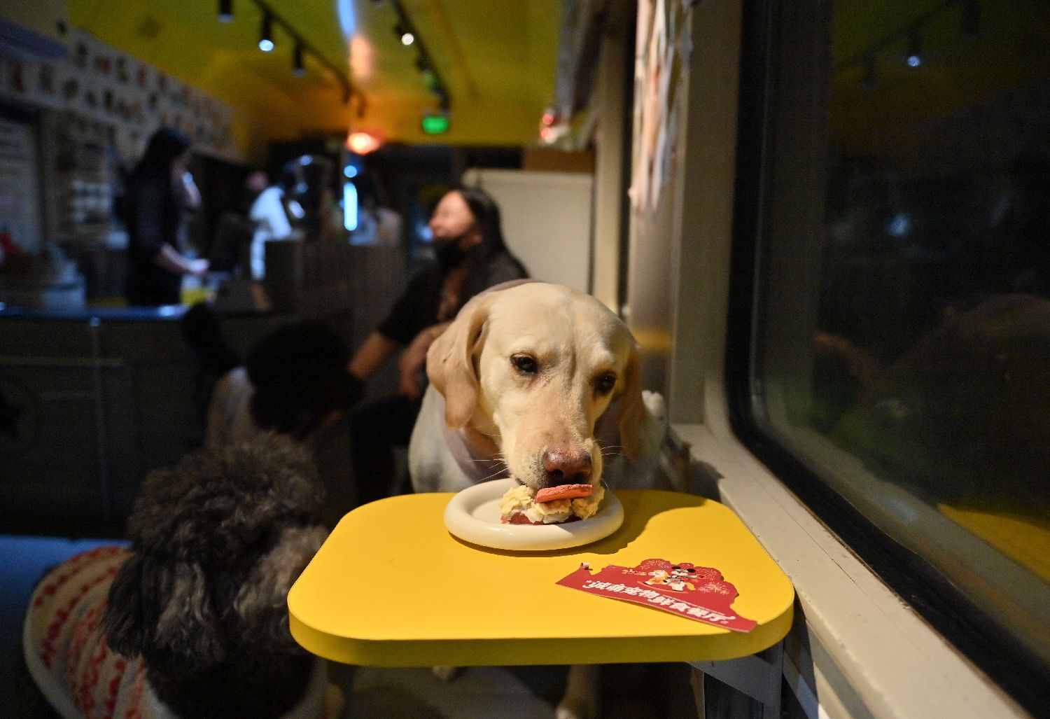2月11日,透过车窗,看到宠物在餐厅内用餐。中新网
