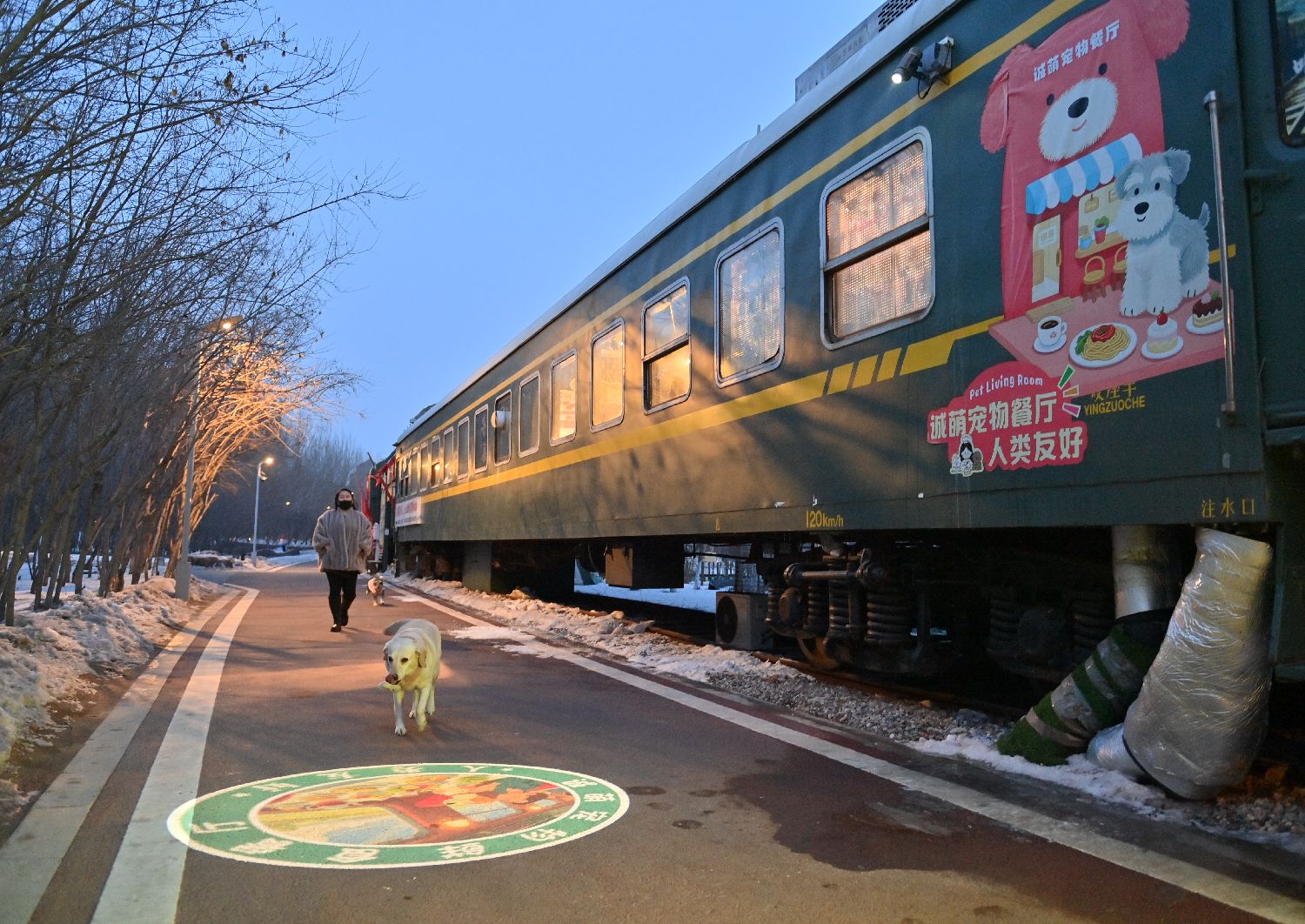 2月11日,一只小狗从火车车厢主题宠物餐厅旁经过。中新社