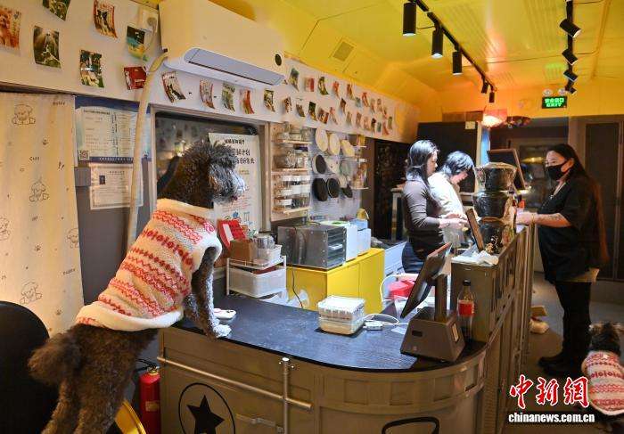 2月11日,宠物狗狗在火车车厢主题宠物餐厅等待用餐。中新社