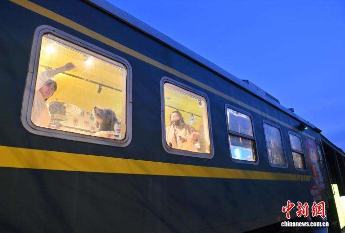 吉林长春的火车车厢主题宠物餐厅集宠物餐饮、游乐与社交功能于一体,为宠物打造沉浸式用餐体验。临近春节,后厨正加紧赶制宠物年夜饭,新年礼盒供不应求,不少宠主早早预订“车厢座位”。图为2月11日,一只狗狗在火车车厢主题宠物餐厅用餐。中新社