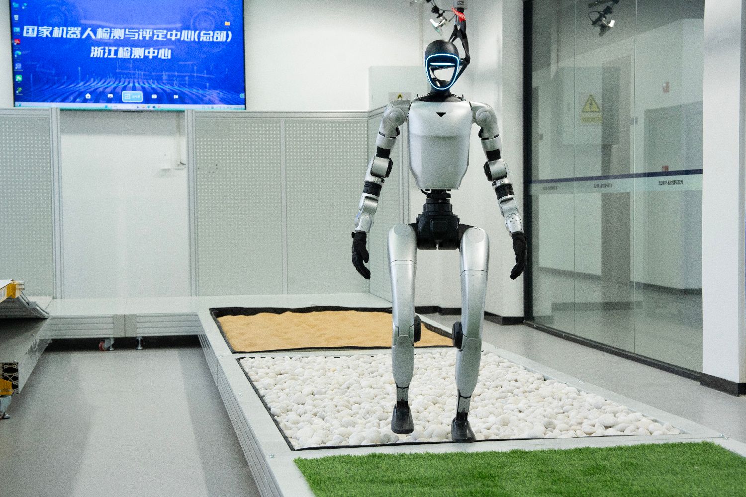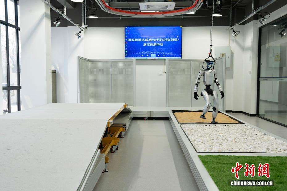 2月12日,一台人形机器人在不同“路况”上进行MTBF(平均无故障间隔时间)的检测。中新网