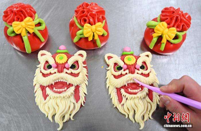 工作人员正在制作醒狮造型的花馍。