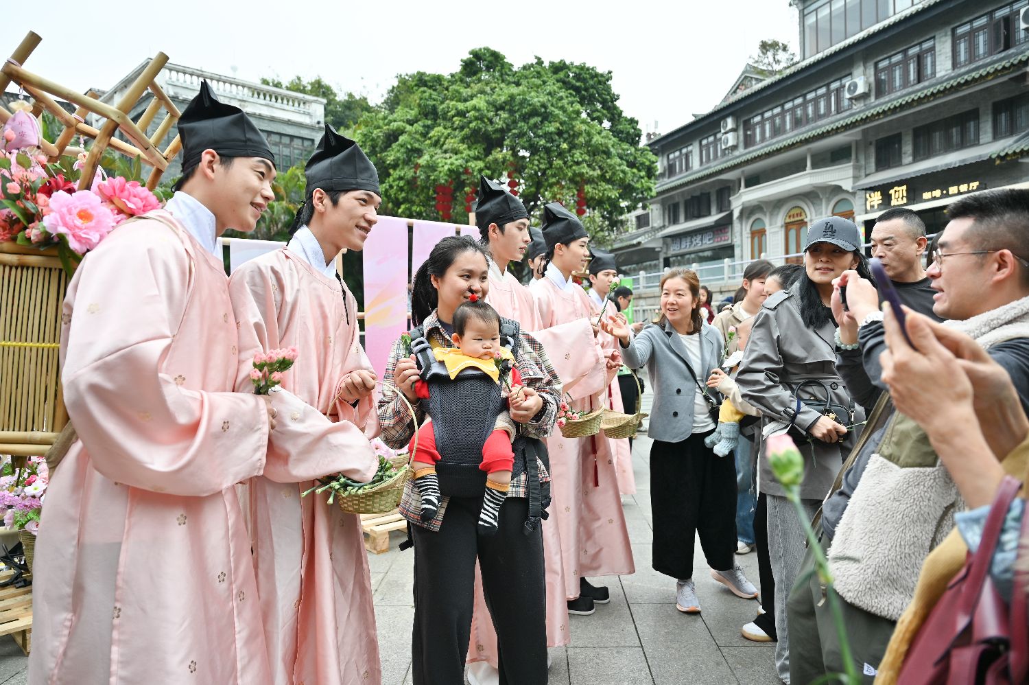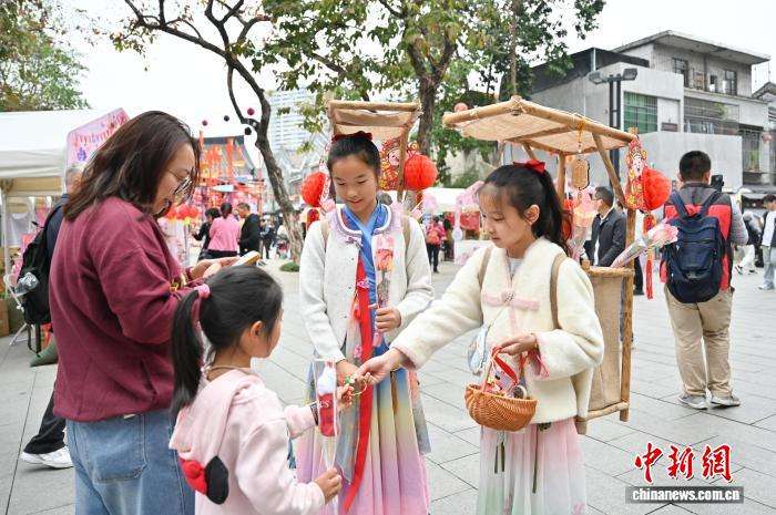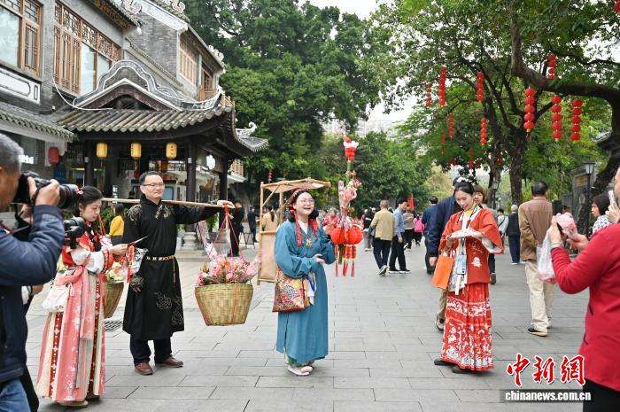 2月12日,2026年广州水上花市在广东广州市西关永庆坊旅游区启幕。本届花市以“花渡千年马跃新春”为主题,活动范围从荔湾湖扩大至荔枝湾涌沿线、粤剧博物馆片区、永庆坊片区,市民游客可在桥上、岸上、船上、花间树下、水榭廊亭等空间打卡花市。图为肩挑花担的“卖货郎”吸引游客合影。中新社