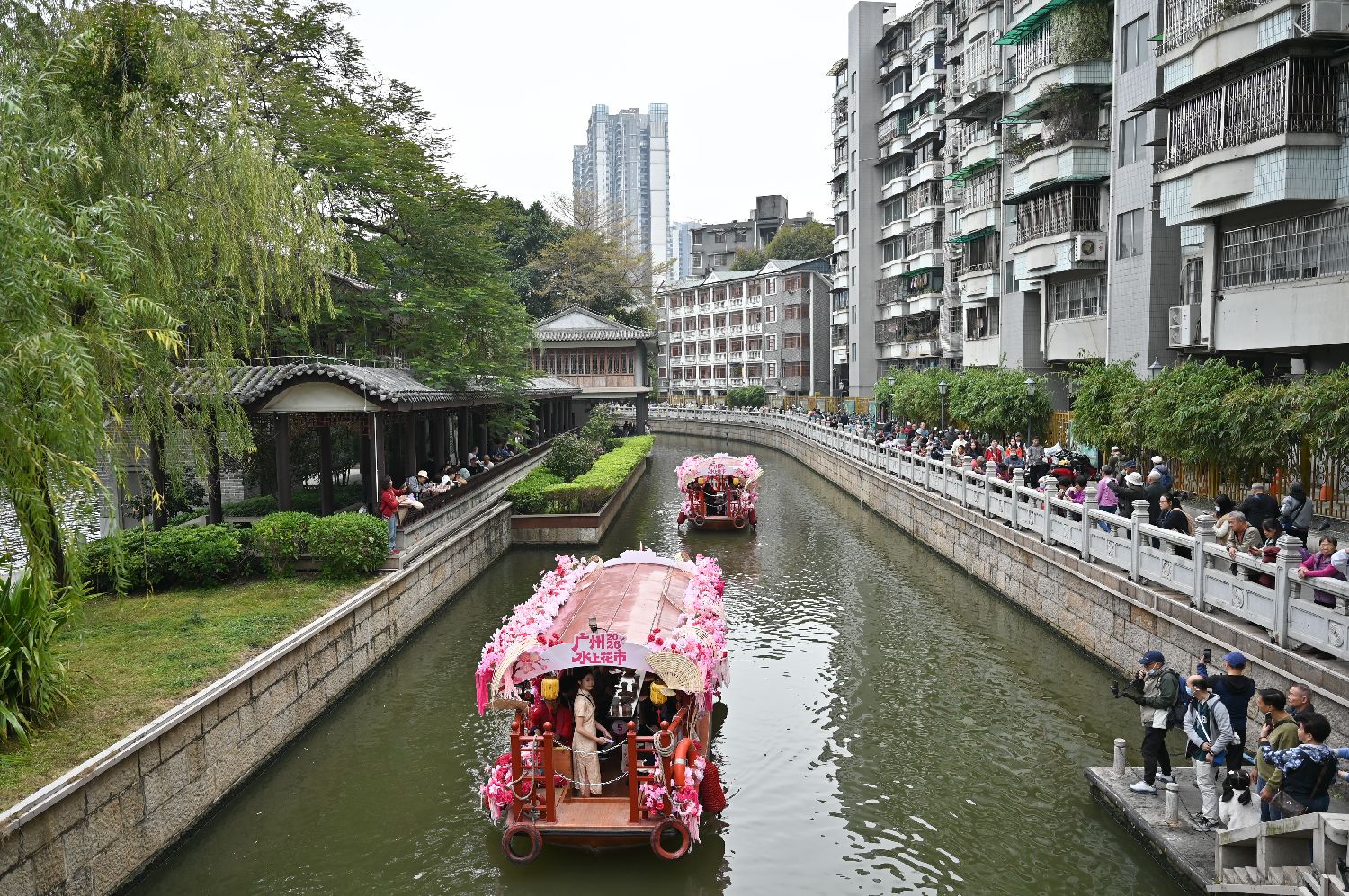 2月12日,花船在荔枝湾涌巡游,吸引游客观看。中新社