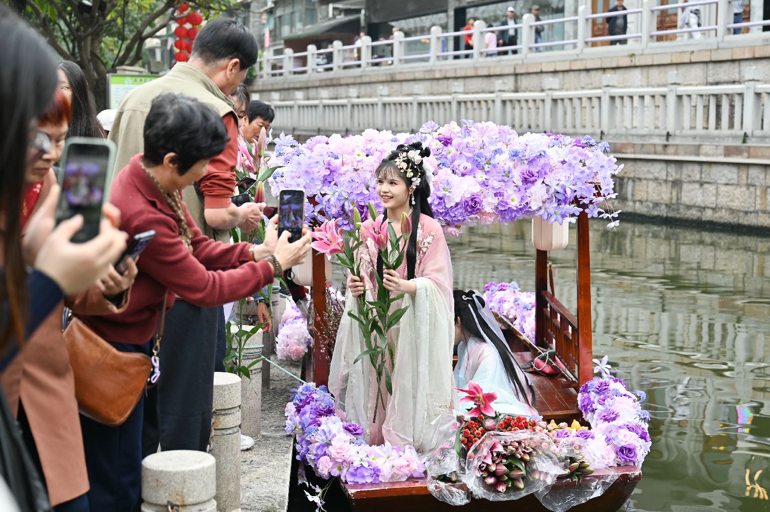 2月12日,身穿古装的“卖花姑娘”在花船上兜售鲜花,吸引游客购买。中新社