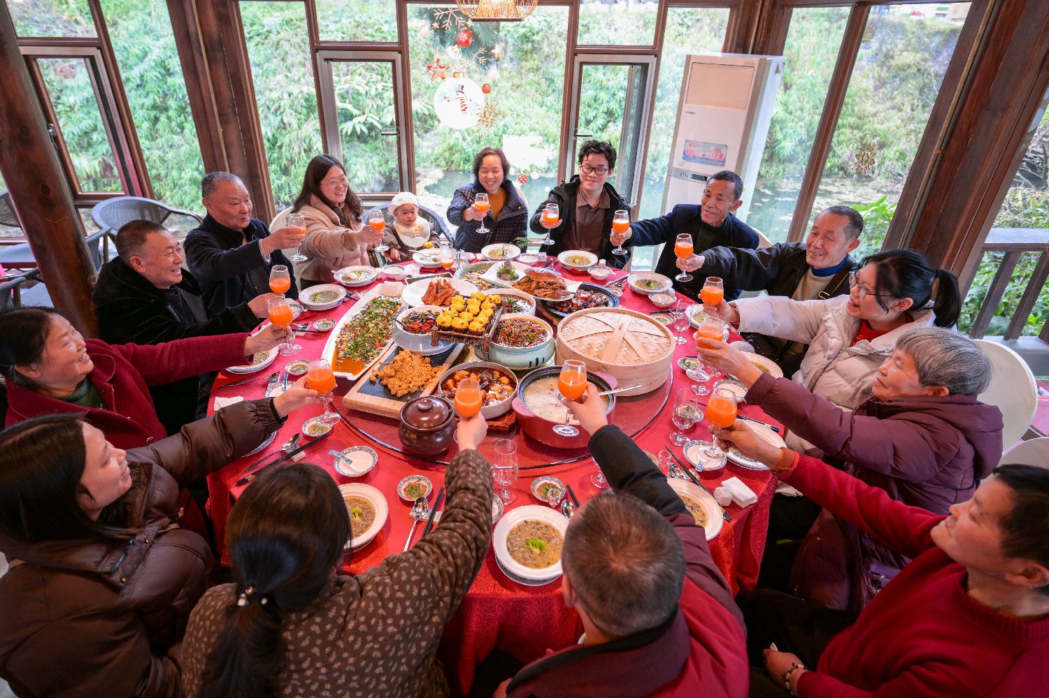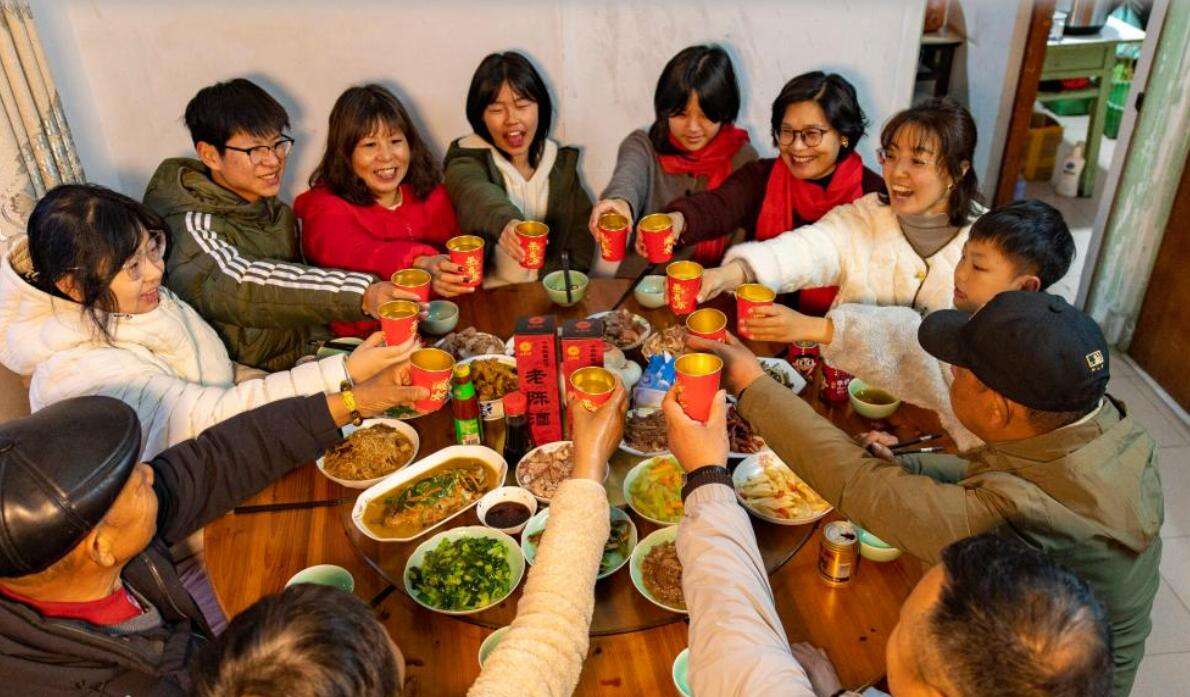 除夕辞旧岁,万家团圆时。在一席热气腾腾的年夜饭中,家人团聚,共庆中国春节。图为2月16日,四川峨眉山下美食村里一家人围坐桌边庆团圆。中新社