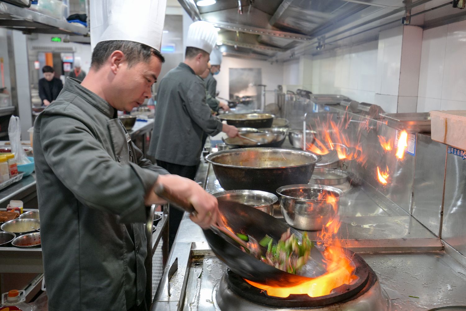 峨眉山下美食村厨房里忙碌的厨师们。中新社