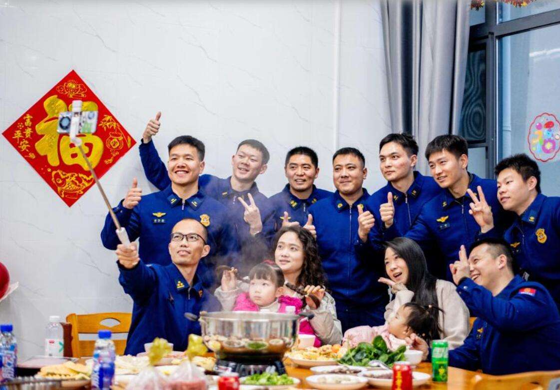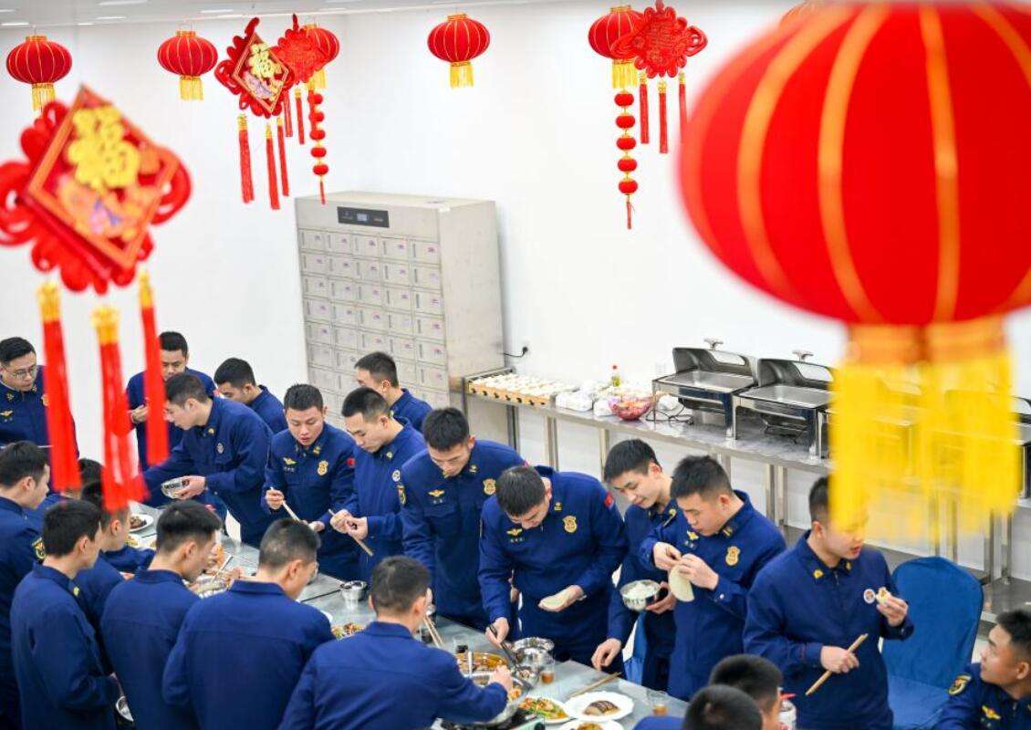 消防员在贵州开阳县消防救援大队食堂吃年夜饭。新华社