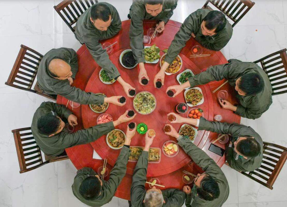 在国网商丘供电公司会亭供电所,电力运维人员在餐厅一起吃年夜饭。新华社