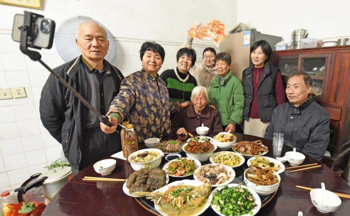 在浙江台州市仙居县安洲街道的一家人在吃年夜饭。新华社