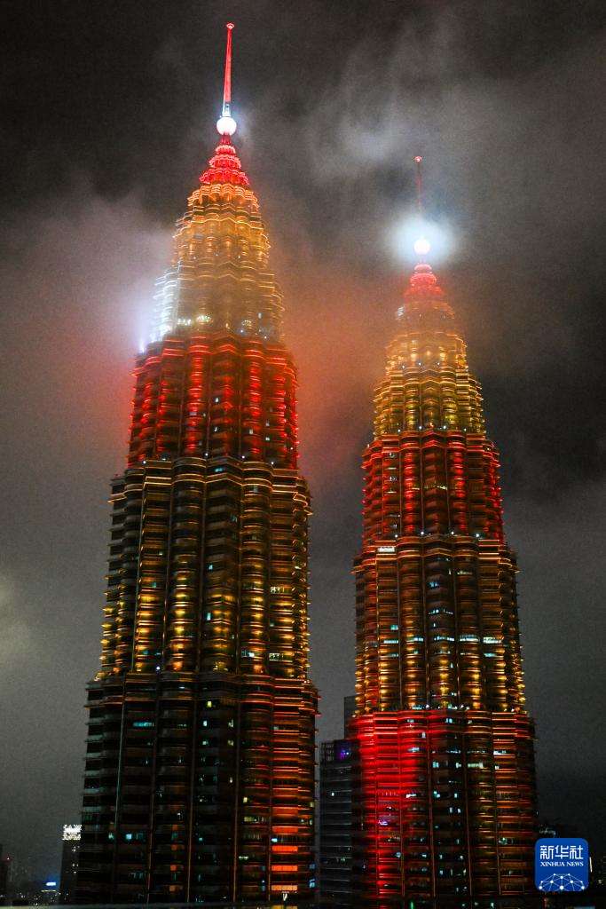 中国农历新年踏着轻盈的脚步走向世界,将喜庆的年味洒满每一个角落。威武的醒狮腾跃起舞,热腾的饺子包裹祝福,中国红如流动的绸缎,温柔地浸润不同肤色的人们。这一刻,东方的节日成为世界的欢歌——不同语言汇成同一声“新年快乐”,不同笑脸辉映着同一种温暖的红色。图为当地时间2月16日,在马来西亚首都吉隆坡,马来西亚国家石油公司双塔换上春节主题灯光迎接春节到来。新华社
