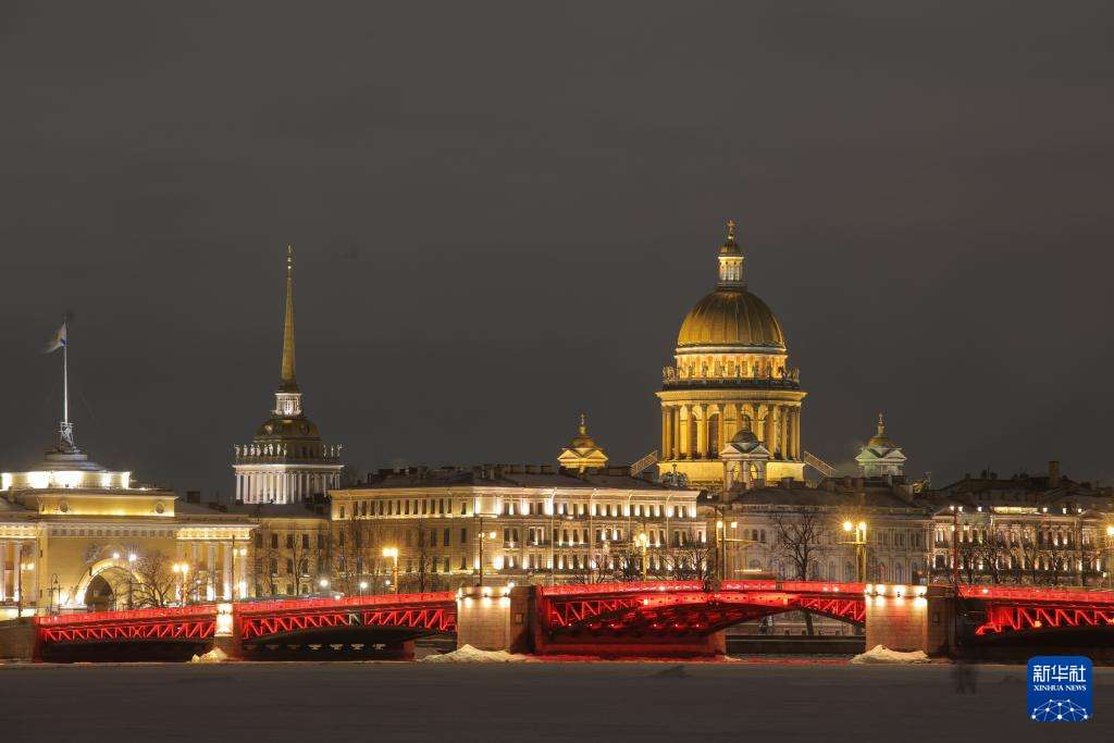 当地时间2月15日晚,俄罗斯圣彼得堡冬宫桥亮起“中国红”,迎接马年春节。新华社