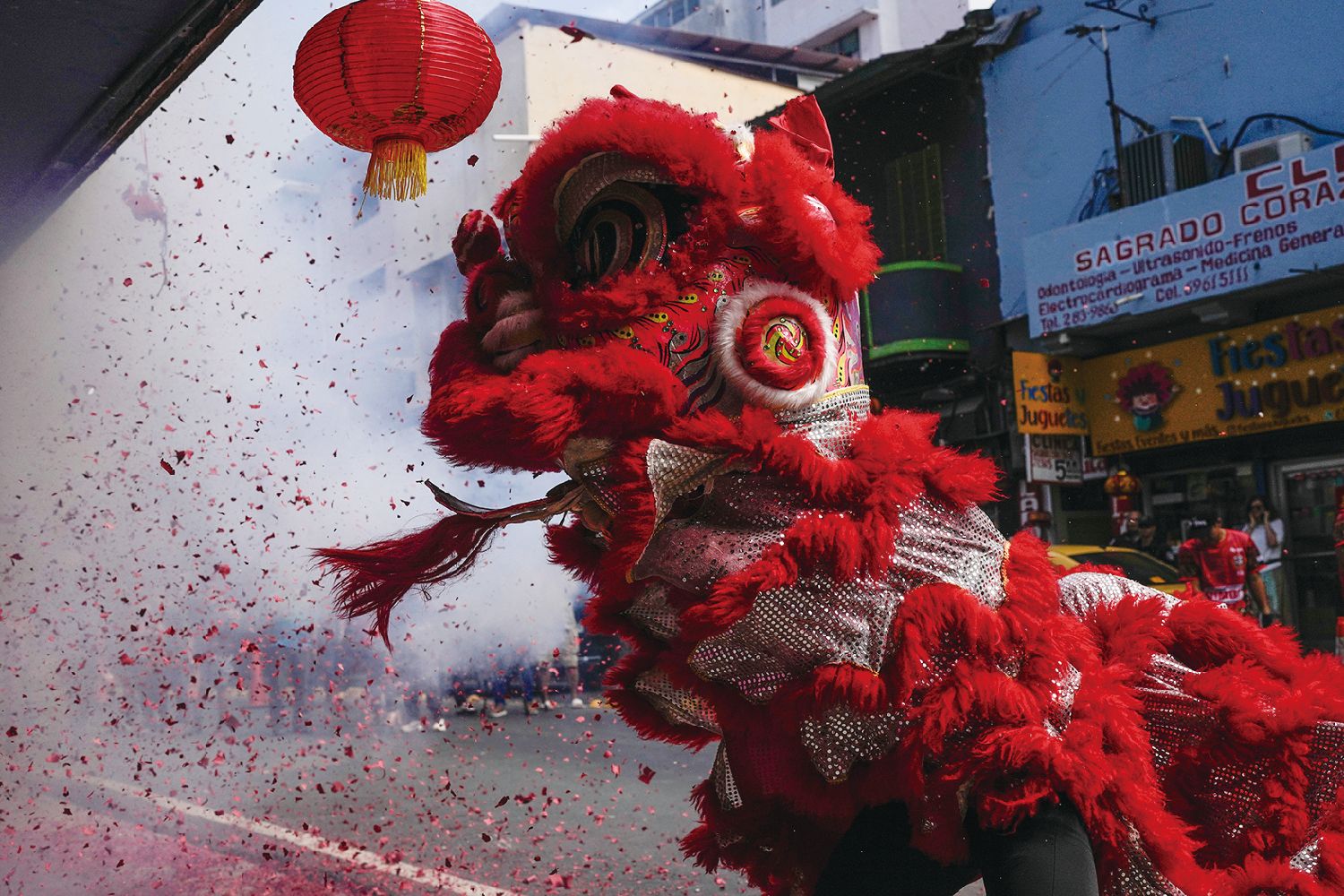 当地时间2月18日,在巴拿马首都巴拿马城,民众放鞭炮、表演舞狮庆祝农历新年。视觉中国