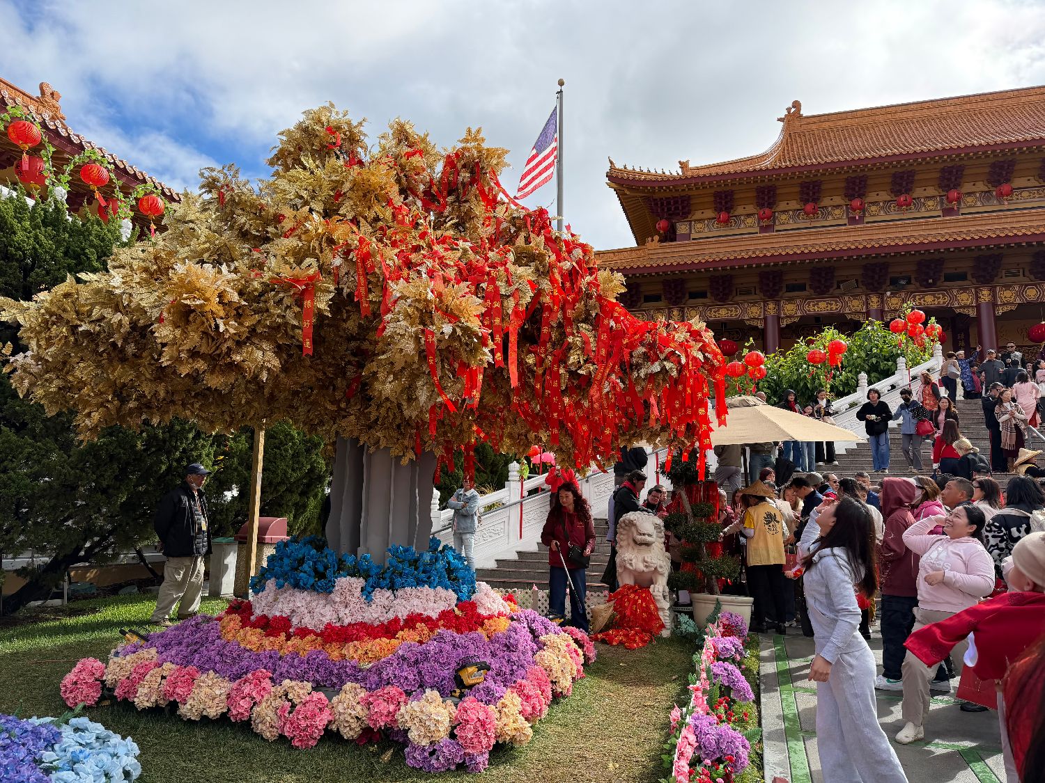 一场洋溢着浓郁传统文化气息的春节庆典于丙午马年大年初一(当地时间2月17日)在美国知名佛教圣地佛光山西来寺举行,各族裔民众同享新年喜悦。图为游客把祈福丝带抛上诸事圆满祈愿树。中新社