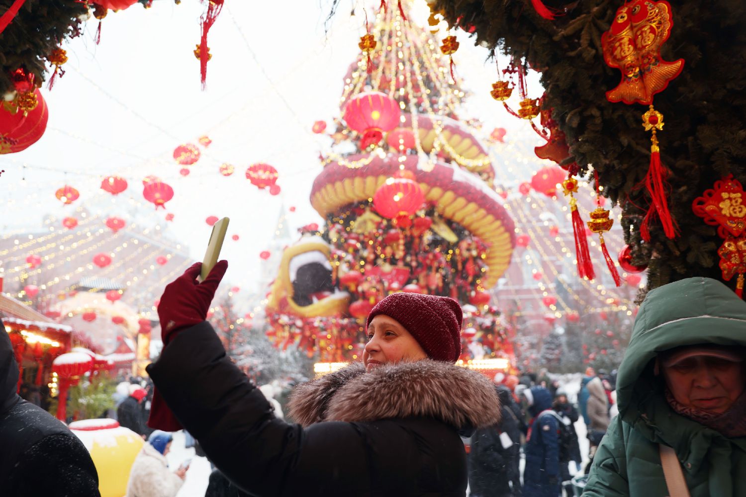 当地时间2月16日,第三届莫斯科“欢乐春节”活动在俄罗斯莫斯科市中心启幕。图为俄罗斯民众在活动现场拍照打卡。中新社