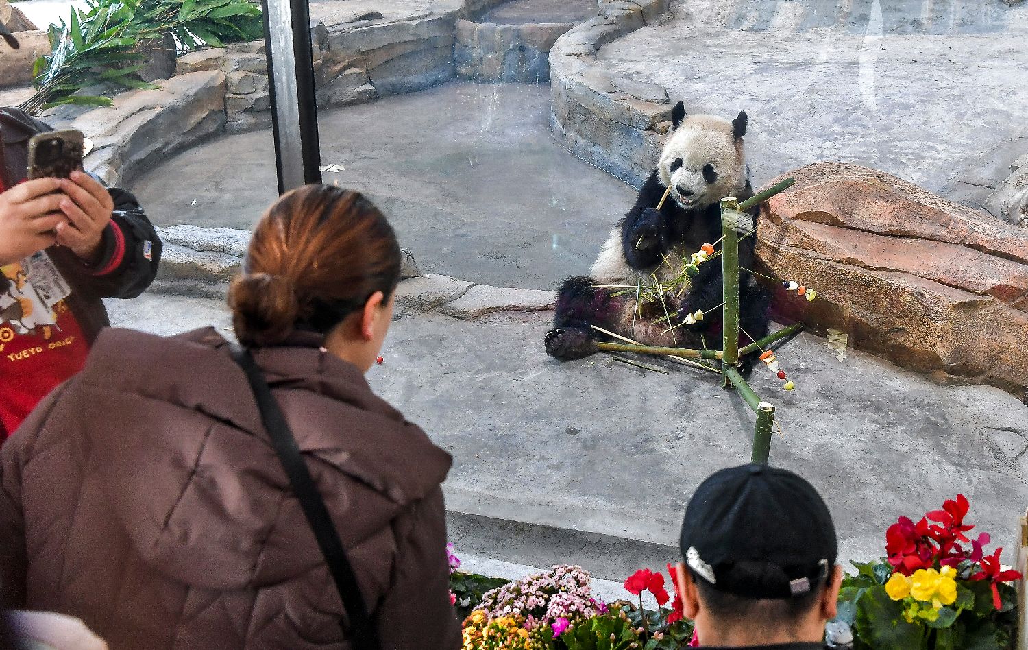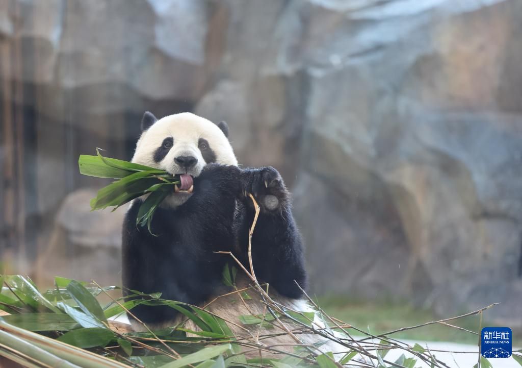 2月19日,新疆乌鲁木齐市水上乐园动物园试营业,该动物园大熊猫馆的两只国宝大熊猫“宝元”“德瑞”也正式与公众见面,为新春佳节增添独特的“萌趣”体验。2月5日,来自中国大熊猫保护研究中心的“宝元”“德瑞”从成都搭乘航班顺利抵达乌鲁木齐。图为大熊猫“宝元”品尝工作人员特意准备的新春大餐。中新社