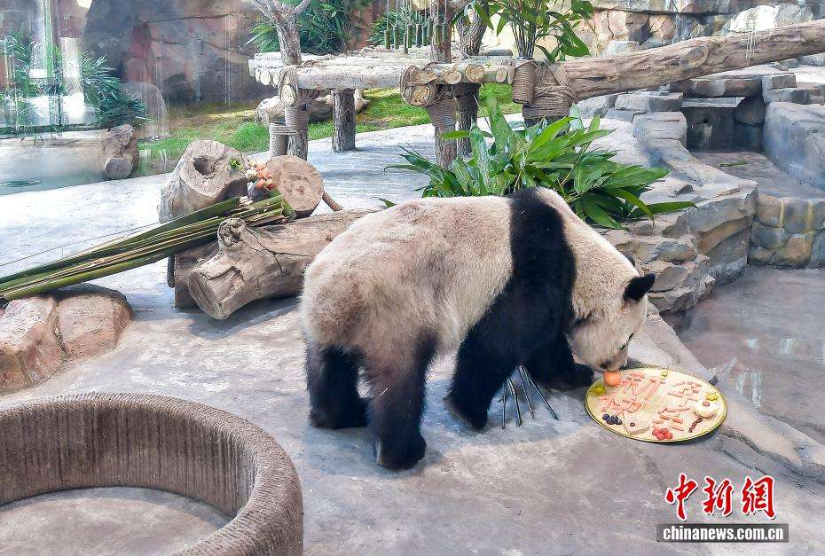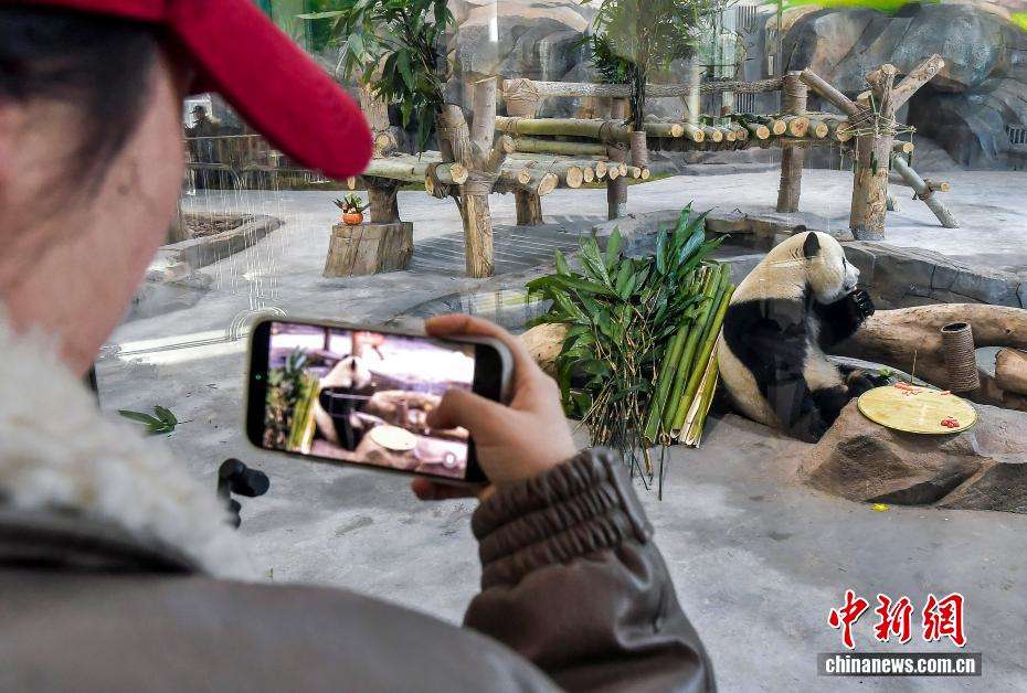 大熊猫“宝元”品尝工作人员特意准备的新春大餐。中新网