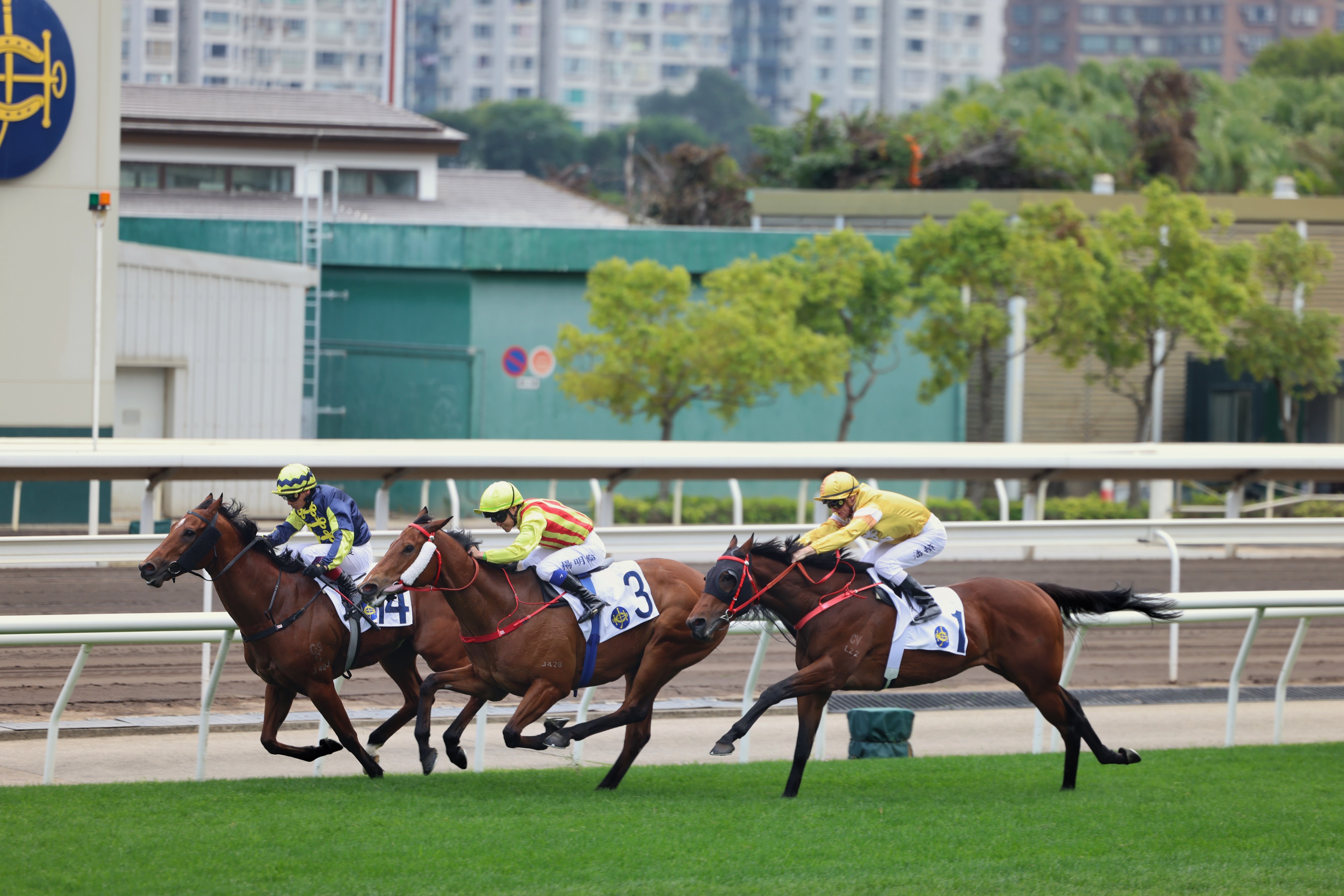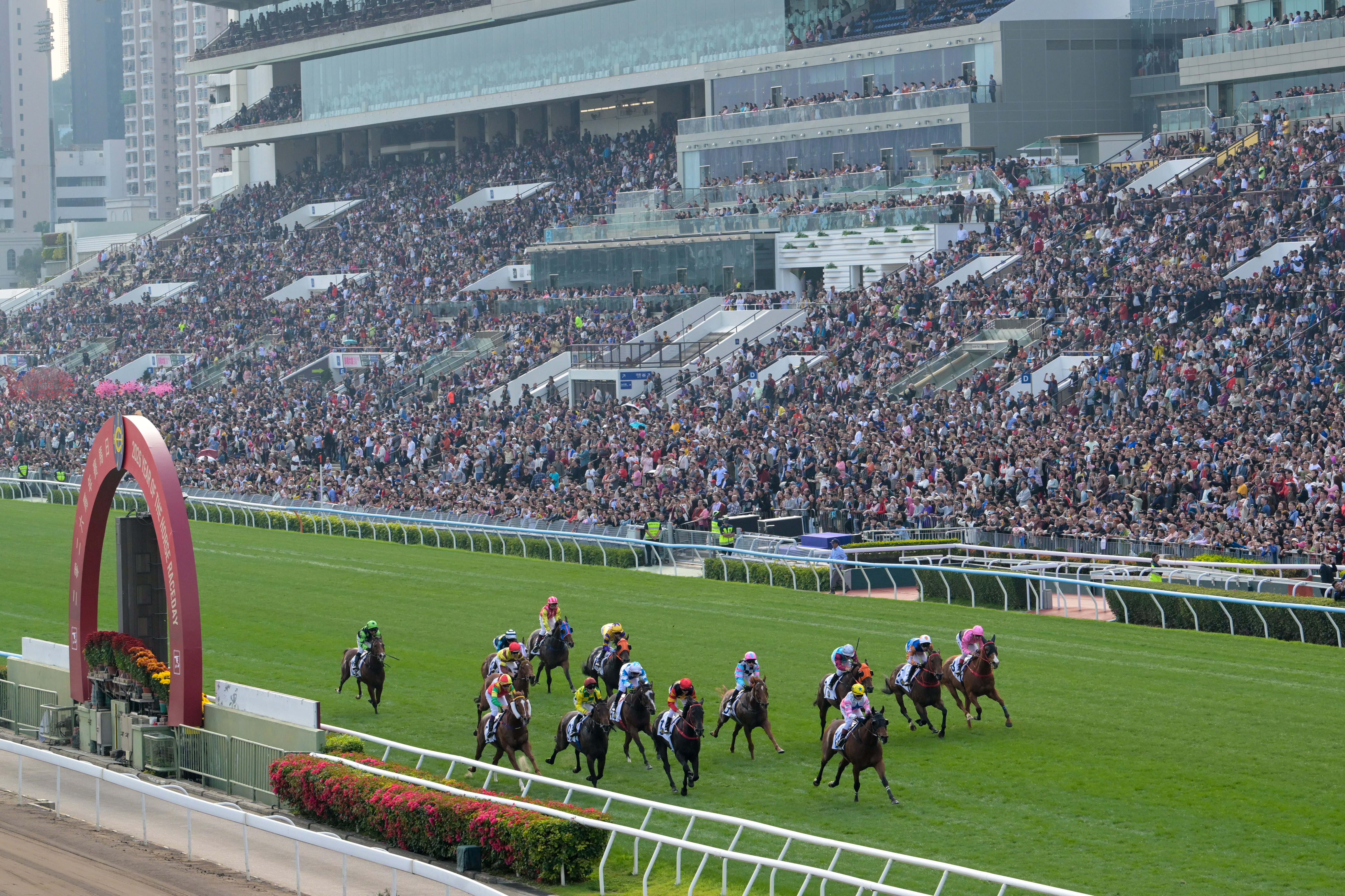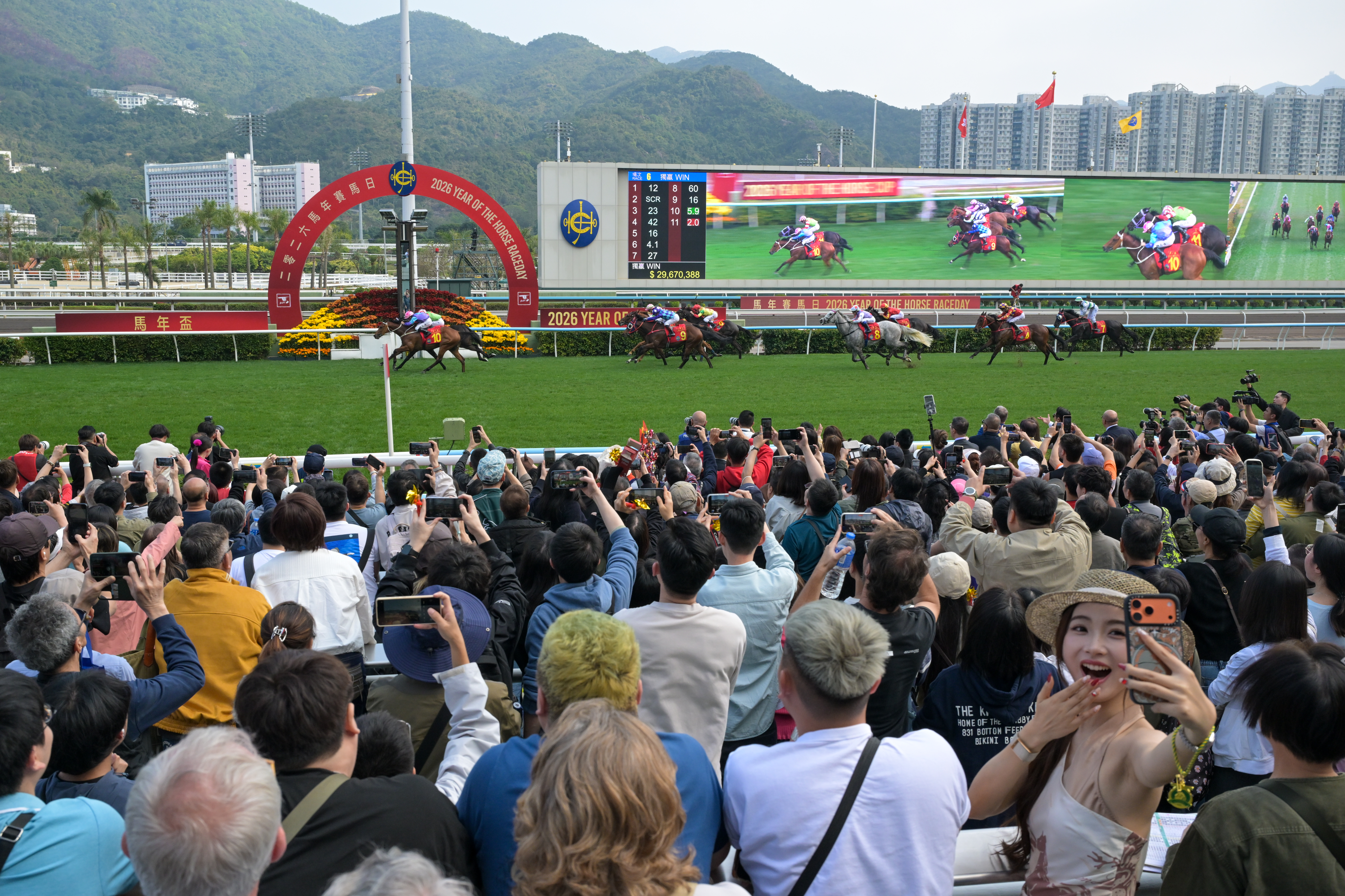 2月19日,2026马年赛马日在香港沙田马场举行,场内贺年节目包括醒狮献瑞、财神送福以及节庆汇演,并设有新春打卡位,让观众现场观赏赛马的同时,尽享浓厚节庆氛围。图为马匹冲线一刻。中新社