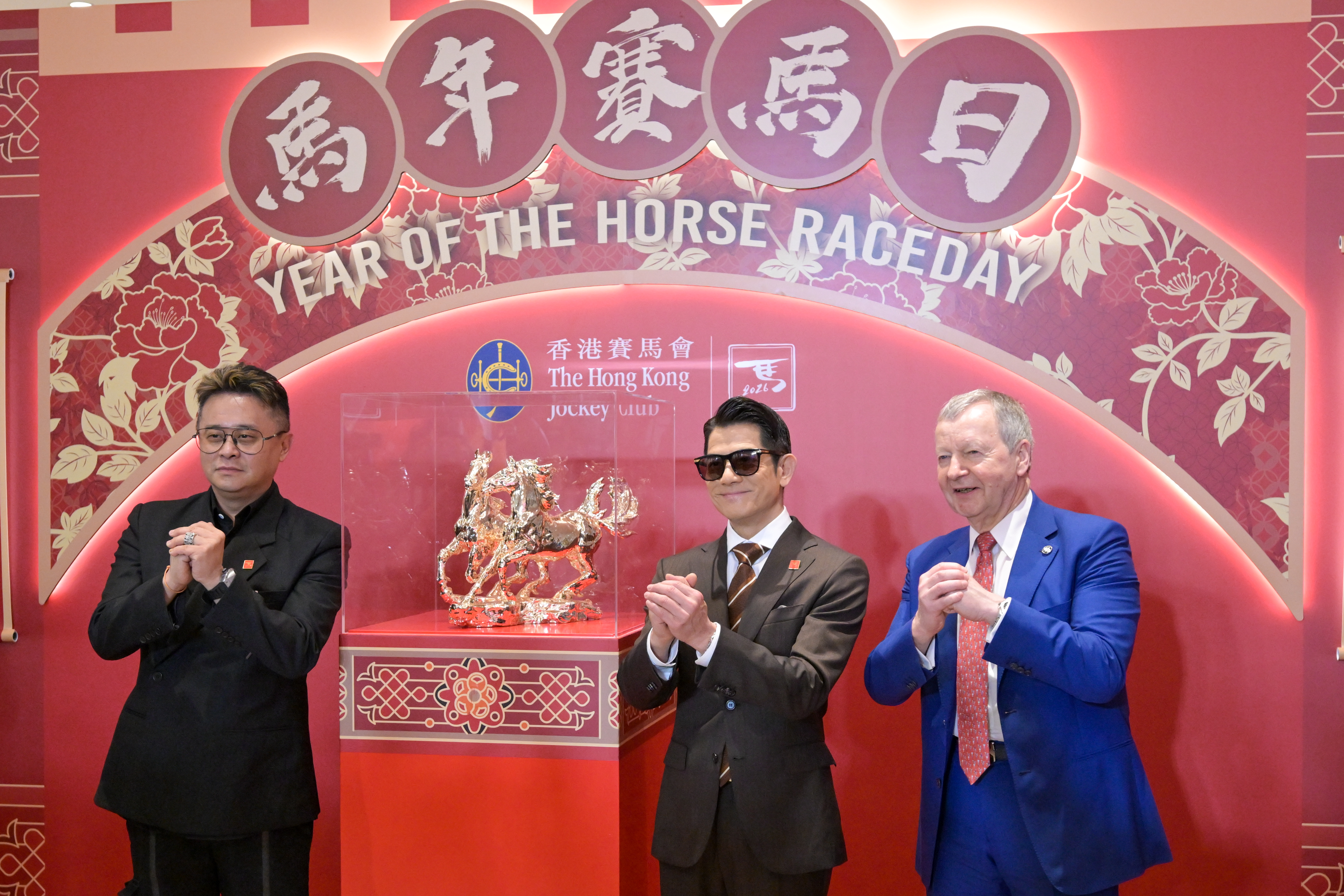 2月19日,香港艺人郭富城(中)出席双骏艺术雕塑揭幕仪式。中新社