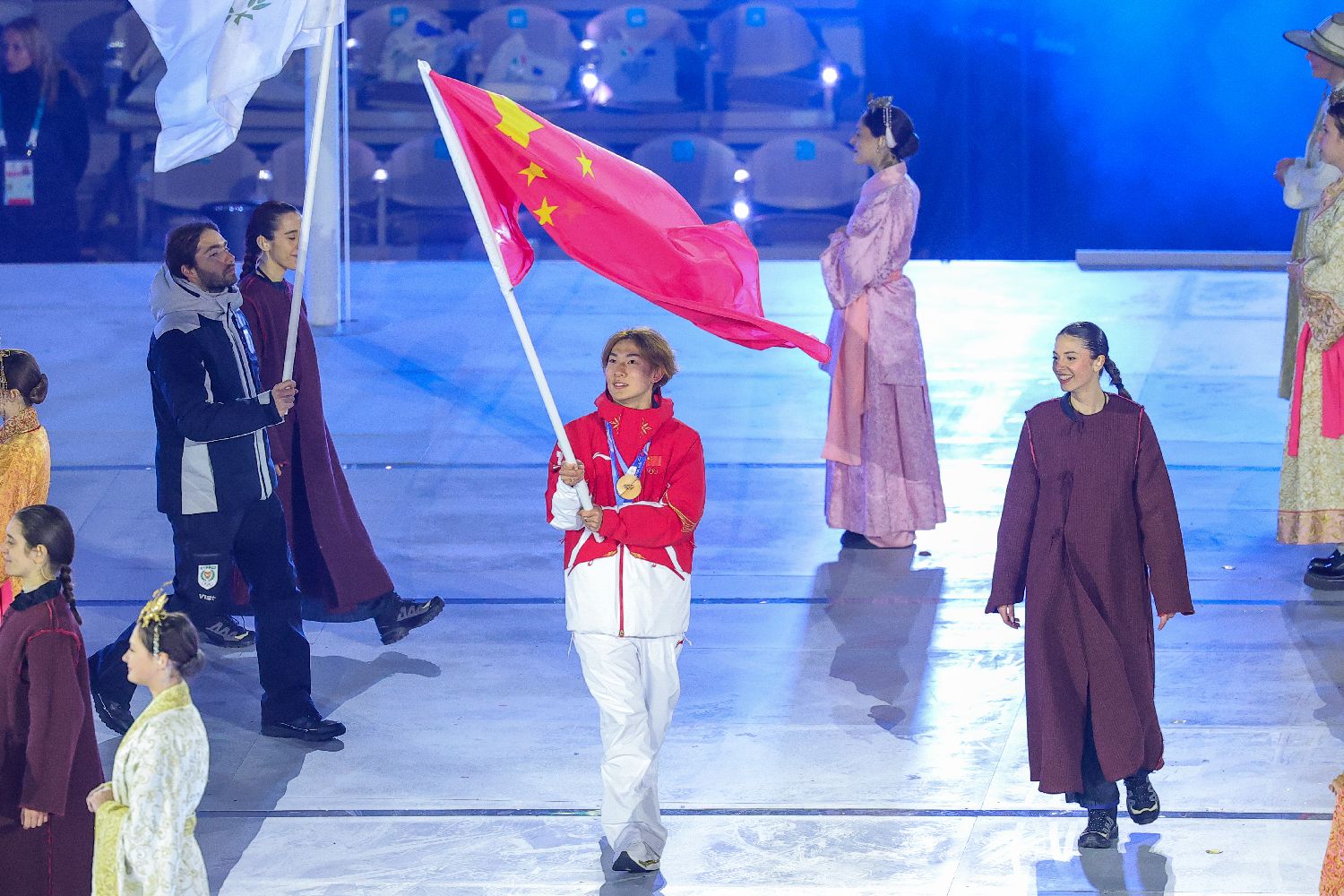 中国体育代表团旗手苏翊鸣挥舞五星红旗入场。中新社