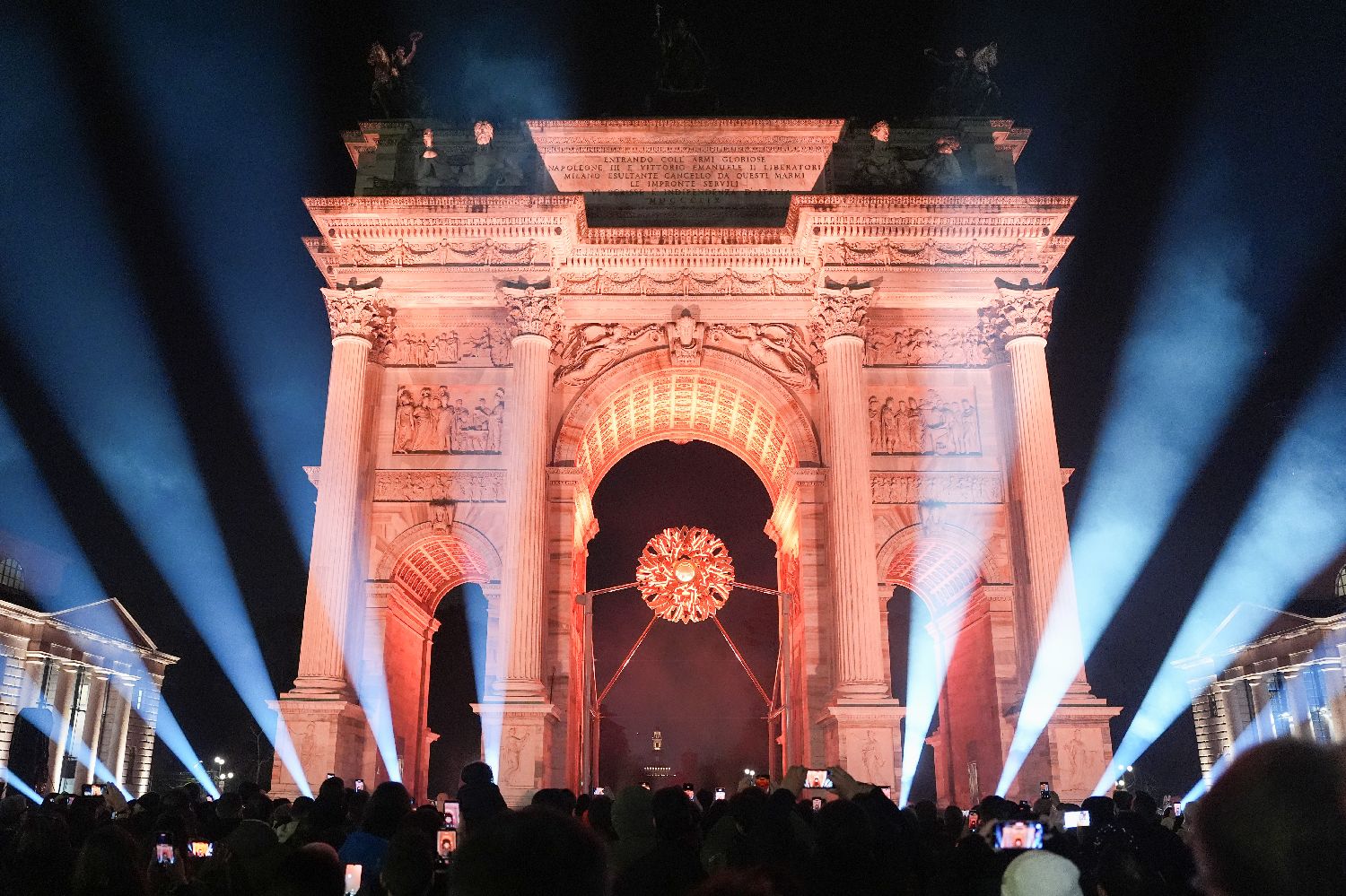 意大利米兰和平拱门,主火炬熄灭前最后一次灯光表演。中新社